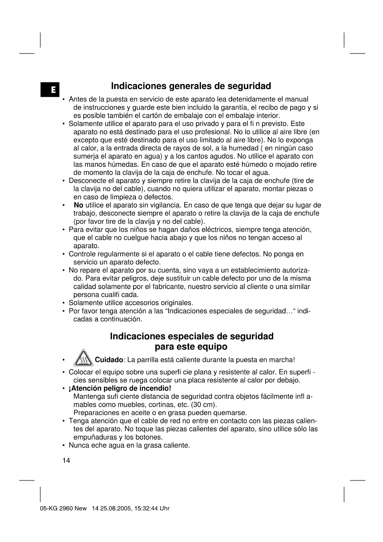 - Después del uso limpie la carcasa con un paño levemente humedecido. Datos técnicos Modelo: ...................................................................................................... KG 2960 Suministro de tensión:.......................................................................... 230 V, 50 Hz Consumo de energía:................................................................................... 1400 W Clase de protección:................................................................................................ Ι Este aparato se ha examinado según las normativas actuales y vigentes de la Comunidad Europea, como p.ej. compatibilidad electromagnética y directiva de baja tensión y se ha construido según las más nuevas especifi caciones en razón de la seguridad. No reservamos el derecho de efectuar modifi caciones técnicas. Garantía Para el aparato comercializado por nosotros nos responsabilizamos con una garantía de 24 meses a partir de la fecha de compra (factura de compra). Durante el período de garantía nos encargamos gratuítamente de los defectos del aparato y de los accesorios*), que se hayan originado por defectos del material o de la fabricación. Dependiendo de nuestra estimación se realizará una reparación o un cambio. ¡Los servicios de garantía no prolangan la garantía, ni se incia por ello un período nuevo de garantía! Como comprobante para la garantía es válido la factura de compra. Sin este comprobante no se podrá realizar un cambio o una reparación gratuíta. En caso de garantía entregue el aparato completo en su embalaje original junto con la factura a su agente comerciante. 05-KG 2960 New 16 25.08.2005, 15:32:45 UhrE