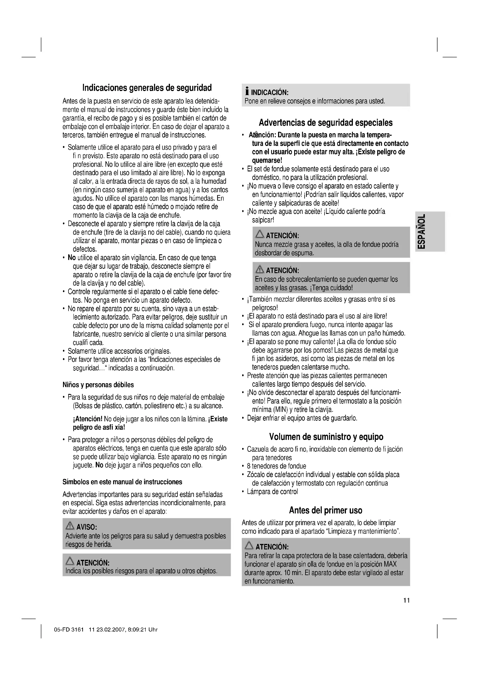 - Lámpara de control Antes del primer uso Antes de utilizar por primera vez el aparato, lo debe limpiar como indicado para el apartado “Limpieza y mantenimiento”. ATENCIÓN: Para retirar la capa protectora de la base calentadora, debería funcionar el aparato sin olla de fondue en la posición MAX durante aprox. 10 min. El aparato debe estar vigilado al estar en funcionamiento. 05-FD 3161 11 23.02.2007, 8:09:21 Uhr12 ESPAÑOL ESPAÑOL INDICACIÓN: Una leve generación de humo es normal. Favor preveer sufi ciente ventilación. Indicaciones para el uso