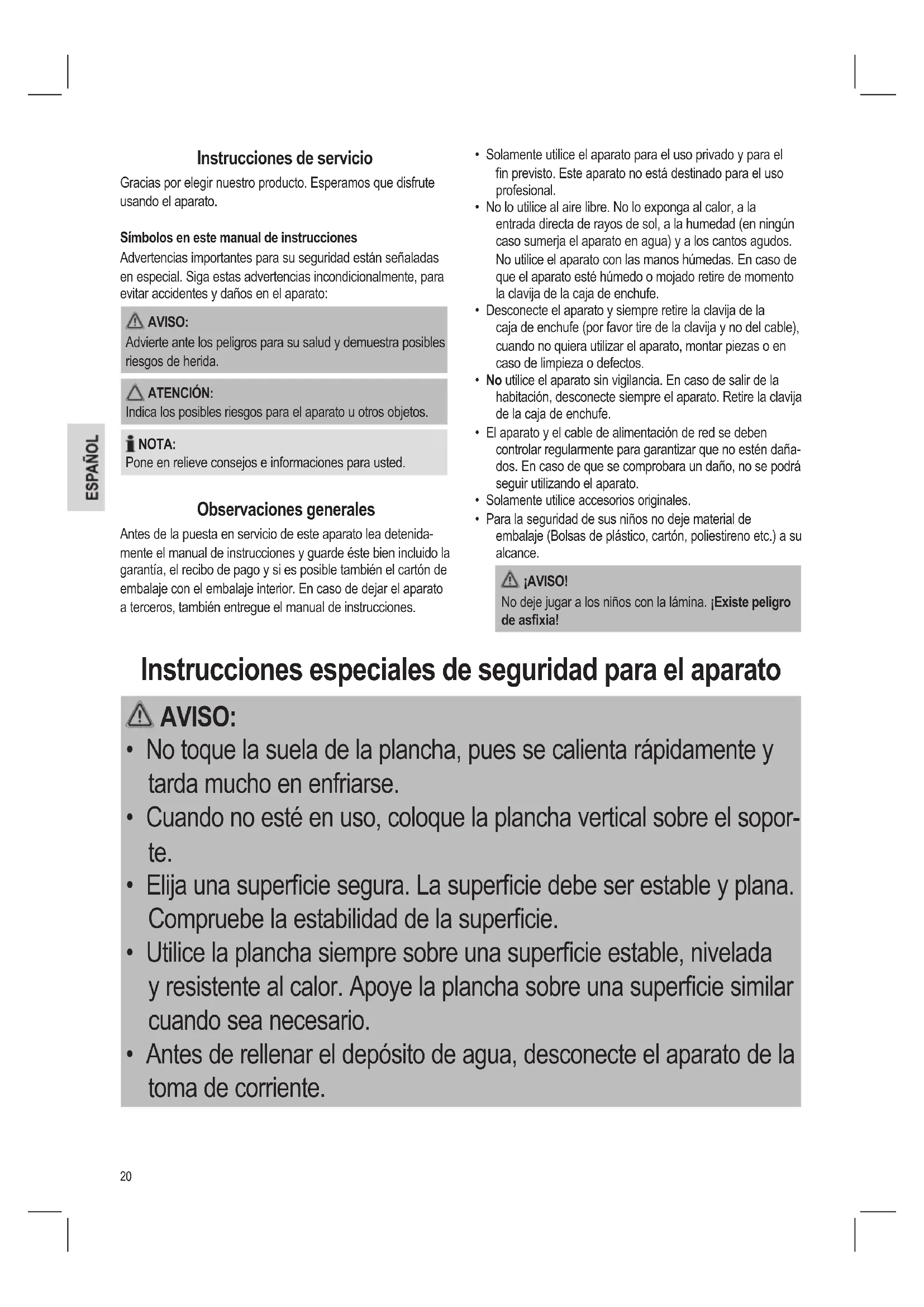 - Para la seguridad de sus niños no deje material de embalaje (Bolsas de plástico, cartón, poliestireno etc.) a su alcance. ¡AVISO! No deje jugar a los niños con la lámina. ¡Existe peligro de asxia! Instrucciones de servicio Gracias por elegir nuestro producto. Esperamos que disfrute usando el aparato. Símbolos en este manual de instrucciones Advertencias importantes para su seguridad están señaladas en especial. Siga estas advertencias incondicionalmente, para evitar accidentes y daños en el aparato: AVISO: Advierte ante los peligros para su salud y demuestra posibles riesgos de herida. ATENCIÓN: Indica los posibles riesgos para el aparato u otros objetos. NOTA: Pone en relieve consejos e informaciones para usted. Observaciones generales Antes de la puesta en servicio de este aparato lea detenida- mente el manual de instrucciones y guarde éste bien incluido la garantía, el recibo de pago y si es posible también el cartón de embalaje con el embalaje interior. En caso de dejar el aparato a terceros, también entregue el manual de instrucciones. Instrucciones especiales de seguridad para el aparato AVISO: