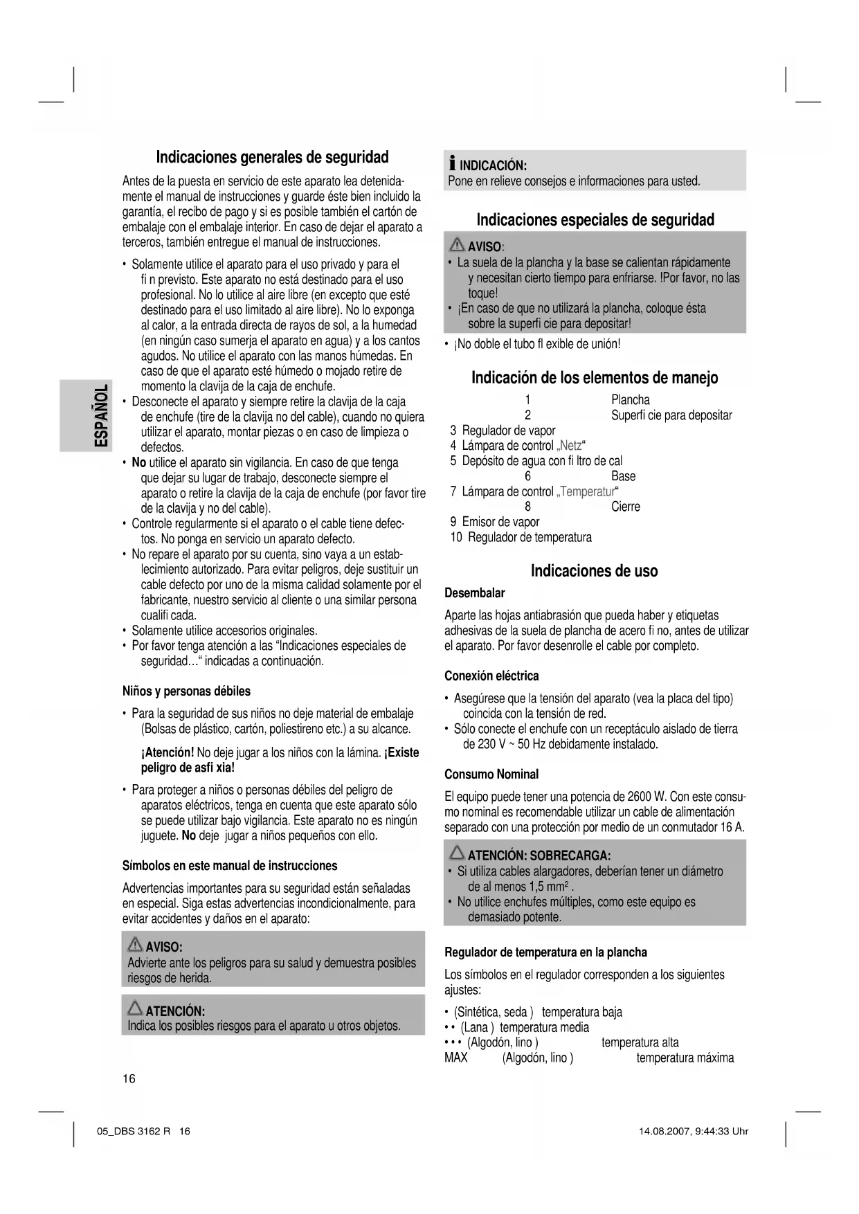 - ¡No doble el tubo fl exible de unión! Indicación de los elementos de manejo 1 Plancha 2 Superfi cie para depositar 3 Regulador de vapor 4 Lámpara de control „Netz“ 5 Depósito de agua con fi ltro de cal 6 Base 7 Lámpara de control „Temperatur“ 8 Cierre 9 Emisor de vapor 10 Regulador de temperatura Indicaciones de uso Desembalar Aparte las hojas antiabrasión que pueda haber y etiquetas adhesivas de la suela de plancha de acero fi no, antes de utilizar el aparato. Por favor desenrolle el cable por completo. Conexión eléctrica