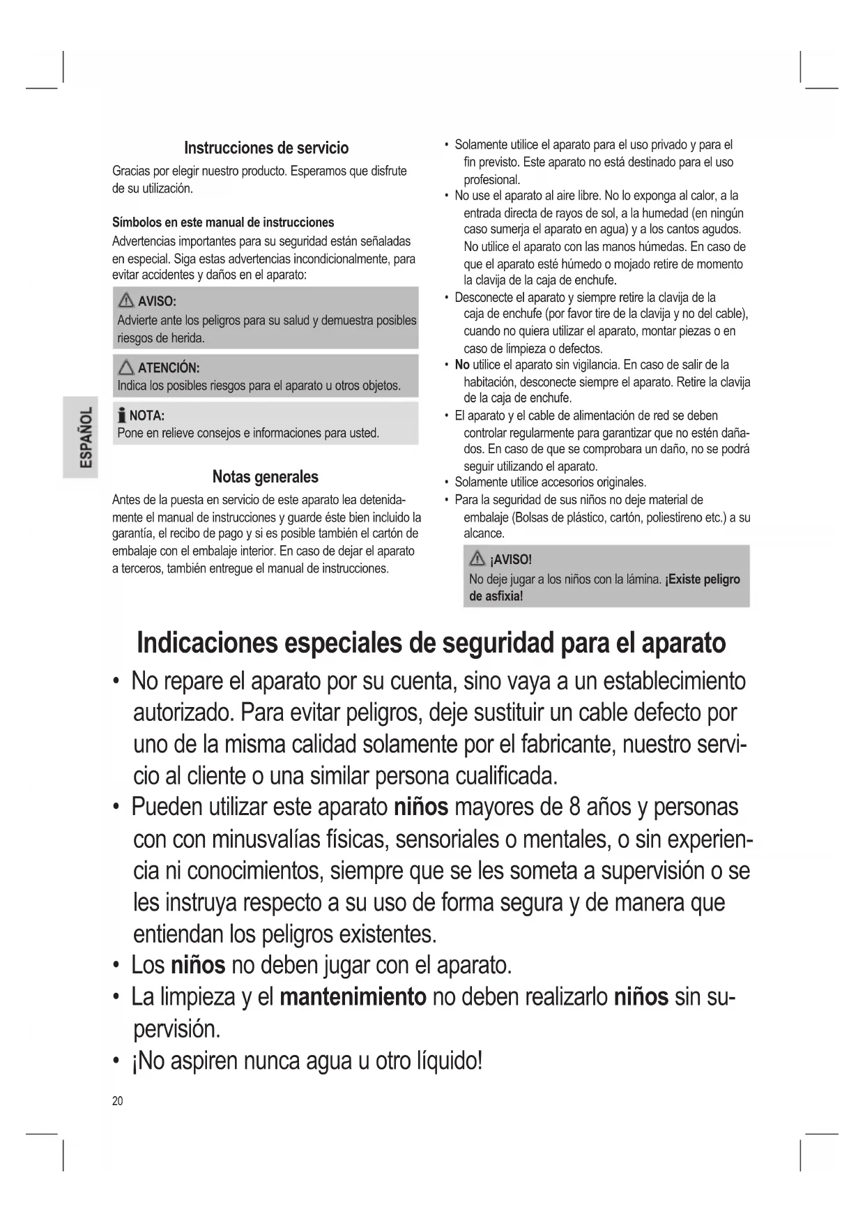 - Para la seguridad de sus niños no deje material de embalaje (Bolsas de plástico, cartón, poliestireno etc.) a su alcance. ¡AVISO! No deje jugar a los niños con la lámina. ¡Existe peligro de asxia! Instrucciones de servicio Gracias por elegir nuestro producto. Esperamos que disfrute de su utilización. Símbolos en este manual de instrucciones Advertencias importantes para su seguridad están señaladas en especial. Siga estas advertencias incondicionalmente, para evitar accidentes y daños en el aparato: AVISO: Advierte ante los peligros para su salud y demuestra posibles riesgos de herida. ATENCIÓN: Indica los posibles riesgos para el aparato u otros objetos. NOTA: Pone en relieve consejos e informaciones para usted. Notas generales Antes de la puesta en servicio de este aparato lea detenida- mente el manual de instrucciones y guarde éste bien incluido la garantía, el recibo de pago y si es posible también el cartón de embalaje con el embalaje interior. En caso de dejar el aparato a terceros, también entregue el manual de instrucciones. Indicaciones especiales de seguridad para el aparato