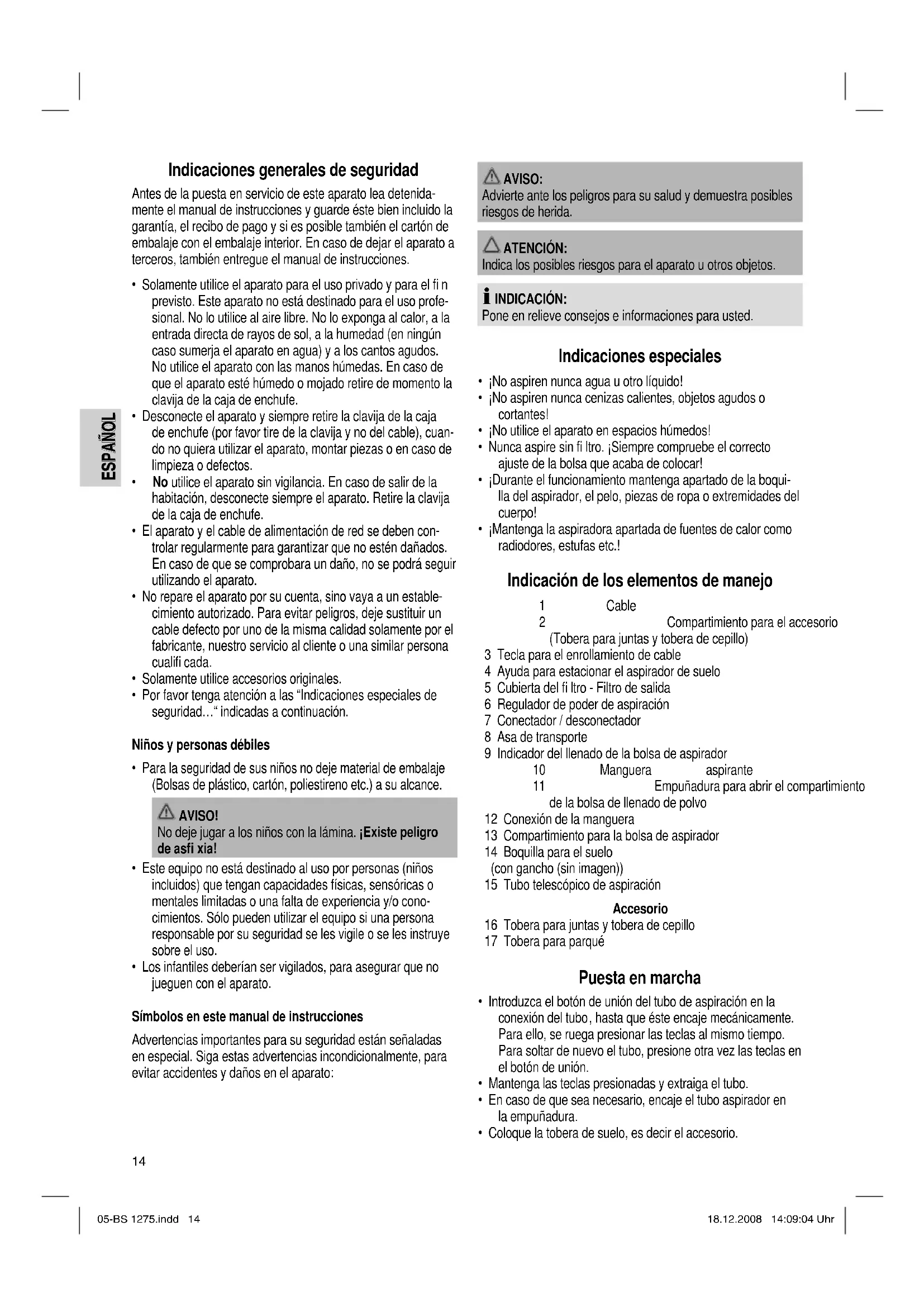 - ¡Mantenga la aspiradora apartada de fuentes de calor como radiodores, estufas etc.! Indicación de los elementos de manejo 1 Cable 2 Compartimiento para el accesorio (Tobera para juntas y tobera de cepillo) 3 Tecla para el enrollamiento de cable 4 Ayuda para estacionar el aspirador de suelo 5 Cubierta del fi ltro - Filtro de salida 6 Regulador de poder de aspiración 7 Conectador / desconectador 8 Asa de transporte 9 Indicador del llenado de la bolsa de aspirador 10 Manguera aspirante 11 Empuñadura para abrir el compartimiento de la bolsa de llenado de polvo 12 Conexión de la manguera 13 Compartimiento para la bolsa de aspirador 14 Boquilla para el suelo (con gancho (sin imagen)) 15 Tubo telescópico de aspiración Accesorio 16 Tobera para juntas y tobera de cepillo 17 Tobera para parqué Puesta en marcha