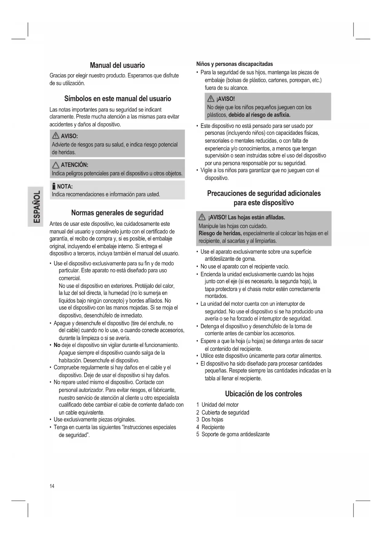 - El dispositivo ha sido diseñado para procesar cantidades pequeñas. Respete siempre las cantidades indicadas en la tabla al llenar el recipiente. Ubicación de los controles 1 Unidad del motor 2 Cubierta de seguridad 3 Dos hojas 4 Recipiente 5 Soporte de goma antideslizante Manual del usuario Gracias por elegir nuestro producto. Esperamos que disfrute de su utilización. Símbolos en este manual del usuario Las notas importantes para su seguridad se indicant claramente. Preste mucha atención a las mismas para evitar accidentes y daños al dispositivo. AVISO: Advierte de riesgos para su salud, e indica riesgo potencial de heridas. ATENCIÓN: Indica peligros potenciales para el dispositivo u otros objetos. NOTA: Indica recomendaciones e información para usted. Normas generales de seguridad Antes de usar este dispositivo, lea cuidadosamente este manual del usuario y consérvelo junto con el certicado de garantía, el recibo de compra y, si es posible, el embalaje original, incluyendo el embalaje interno. Si entrega el dispositivo a terceros, incluya también el manual del usuario.