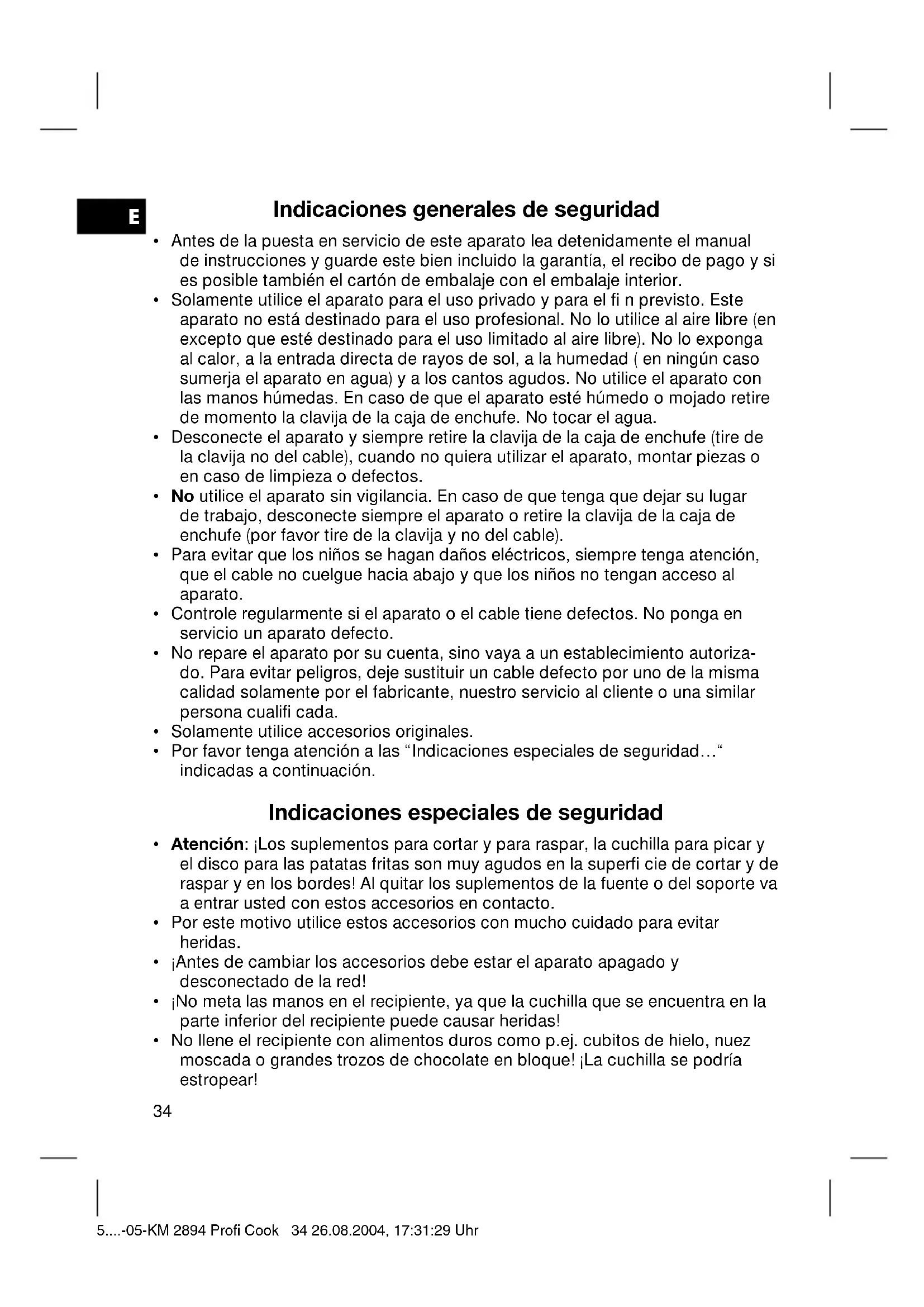 - No llene el recipiente con alimentos duros como p.ej. cubitos de hielo, nuez moscada o grandes trozos de chocolate en bloque! ¡La cuchilla se podría estropear! 5....-05-KM 2894 Profi Cook 34 26.08.2004, 17:31:29 UhrE