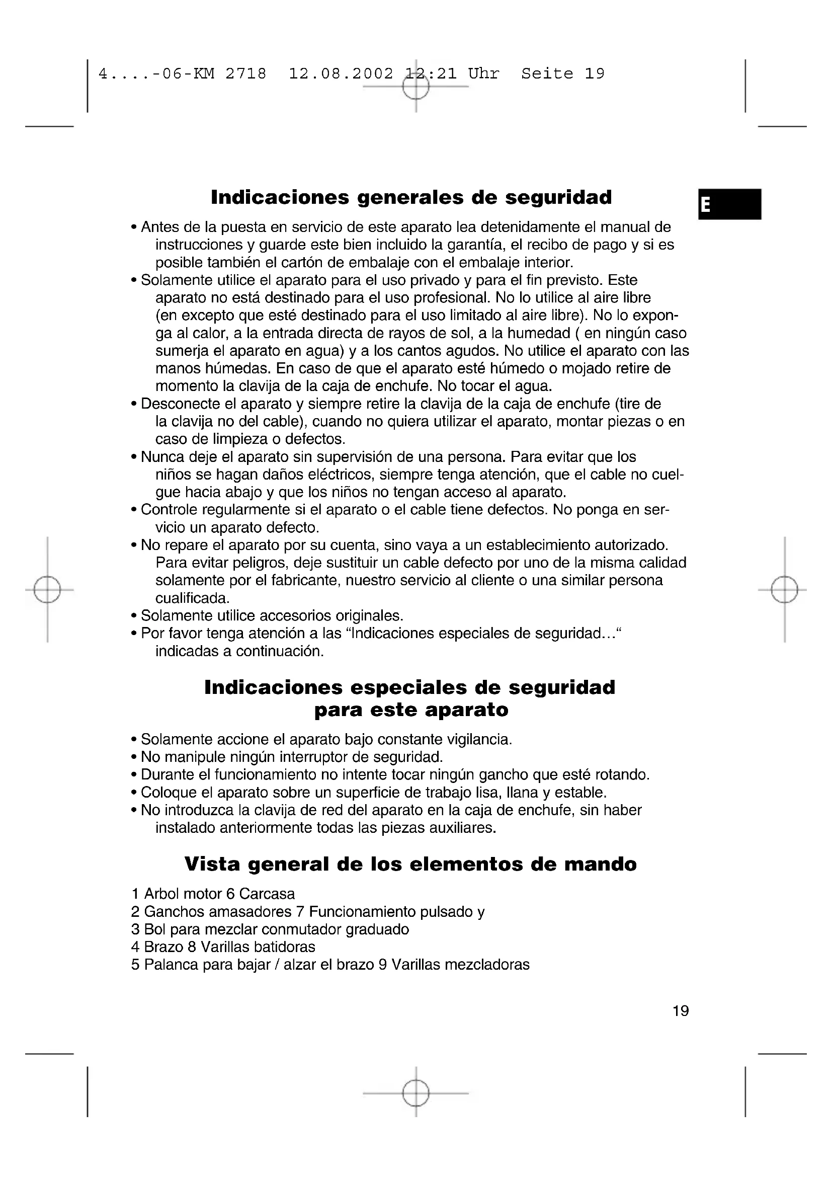 4....-06-KM 2718 12.08.2002 12:21 Uhr Seite 21remojadas y la sal en el bol para mezclar. Amasar en el grado 1, después conmutar al grado 2 y seguir amasando de 3 a 5 minutos más. Cubrir la masa, dejar que suba la masa de 45-60 minutos en un lugar cálido. Amasar de nuevo, retirar del bol y formar 16 panecillos. Cubrir la bandeja de horno con papel de horno mojado. Colocar los panecillos, dejar que suban 15 minutos, recubrirlos con agua templada y cocerlos. Horno convencional: Altura de introducción: 2 Calentamiento: Horno eléctrico caldo superior e inferior 200-220° (precalentar 5 minutos), Horno de gas: grado 2-3 Tiempo de cocción: 30-40 minutos Crema de chocolate grado 5-6 Ingredientes: 200ml de nata dulce, 150g de chocolate de cubierta semi-amargo, 3 huevos, 50- 60g de azúcar, una pizca de sal, 1 bolsita de vainilla azucarada, 1 cucharada de coñac o de ron, hojas de chocolate. Preparación: Montar la nata con las varillas batidoras en el bol para mezclar. Retirarla del bol y mantenerla fría. Derretir la cubierta según instrucción, o en el microonda en 3 minu- tos con 600 vatios. Mientras tanto, mezclar en el bol de forma espumosa con las varillas batidoras en el grado 3, los huevos, el azúcar, la vainilla azucarada, coñac o ron y la sal. Añadir la cubierta derretida y mezclar las masas de forma homogénea en el grado 5-6. De la nata montada dejar algo aparte para la decoración. Añadir la nata restante a la crema y mezclarla breve con el funcionamiento pulsado. Decorar la crema de chocolate y servirla bien fría. Este aparato se ha examinado según las normativas actuales y vigentes de la Comunidad Europea, como p.ej. compatibilidad electromagnética y directiva de baja tensión y se ha construido según las más nuevas especificaciones en razón de la seguridad. No reservamos el derecho de efectuar modificaciones técnicas. Garantía Para el aparato comercializado por nosotros nos responsabilizamos con una garantía de 24 meses a partir de la fecha de compra (factura de compra). Durante el período de garantía nos encargamos gratuítamente de los defectos del aparato y de los accesorios*), que se hayan originado por defectos del material o de la fabricación. Dependiendo de nuestra estimación se realizará una reparación