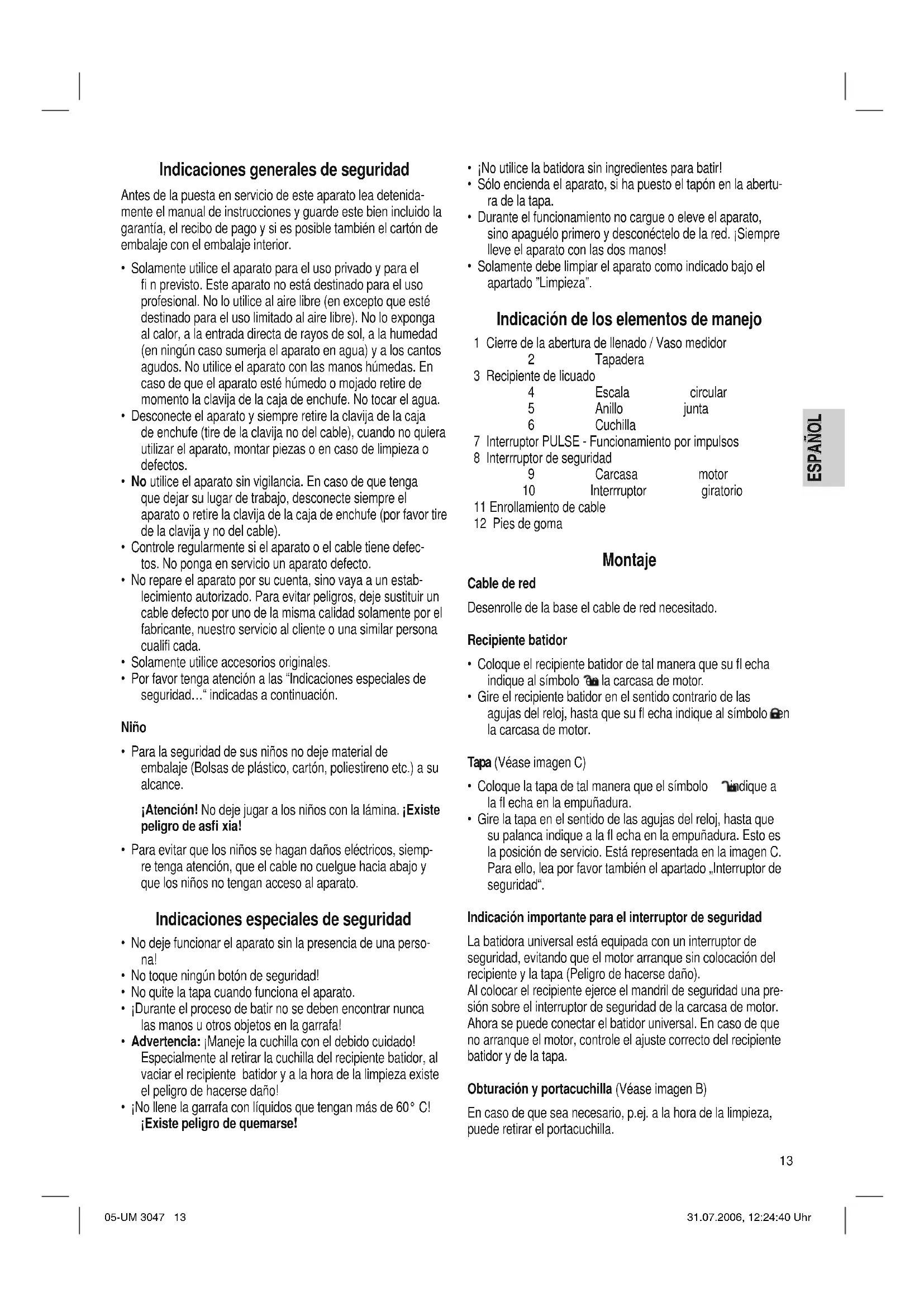 - El aparato no tiene función. Remedio: Supervise la conexión a la red. Controle la posición del interruptor giratorio. Otras posibles causas: Su aparato está equipado con un interruptor de seguri- dad. Este evita la conexión no intencional del motor. 05-UM 3047 14 31.07.2006, 12:24:41 UhrESPAÑOL