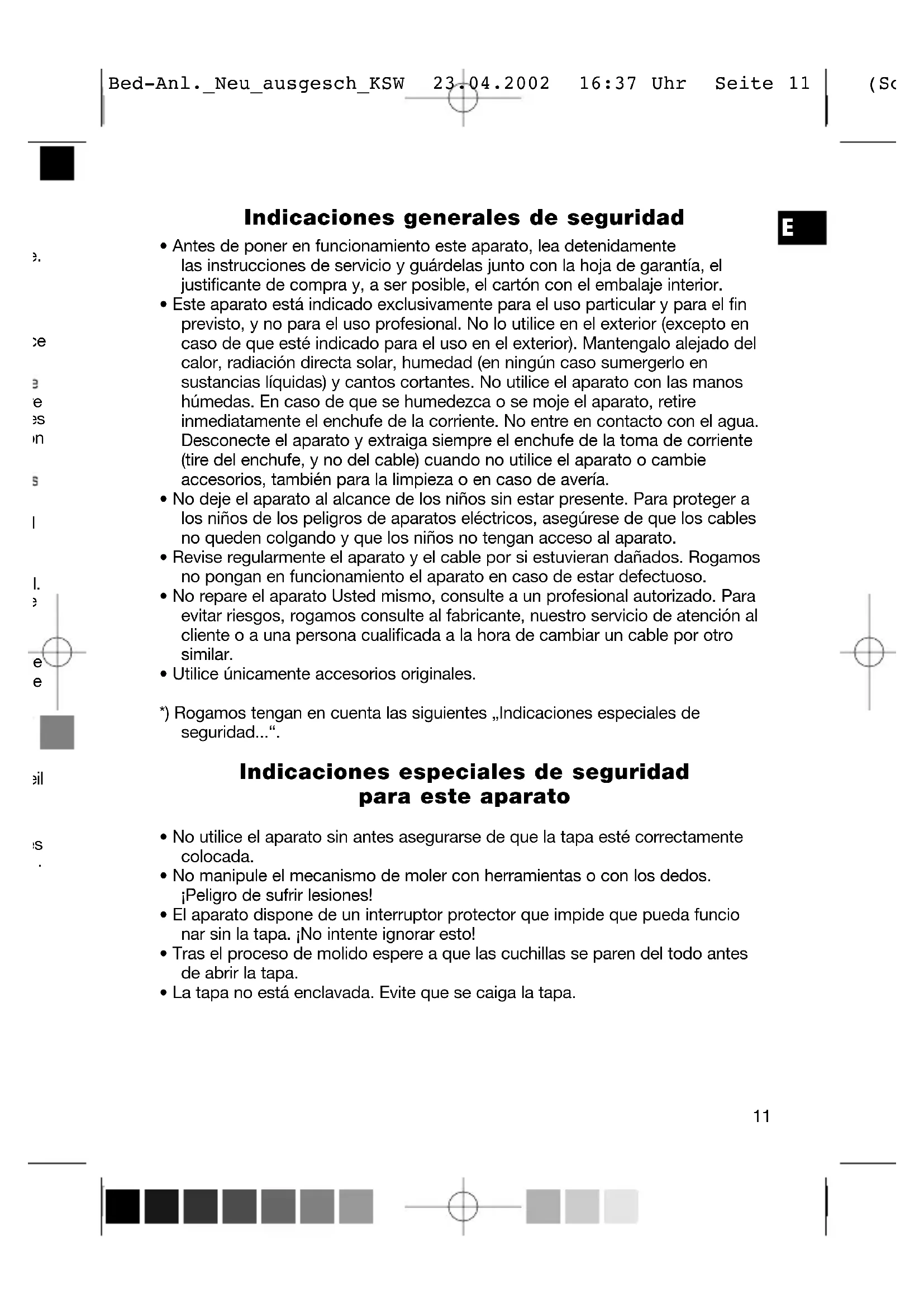- Utilice únicamente accesorios originales. *) Rogamos tengan en cuenta las siguientes „Indicaciones especiales de seguridad...“. Indicaciones especiales de seguridad para este aparato