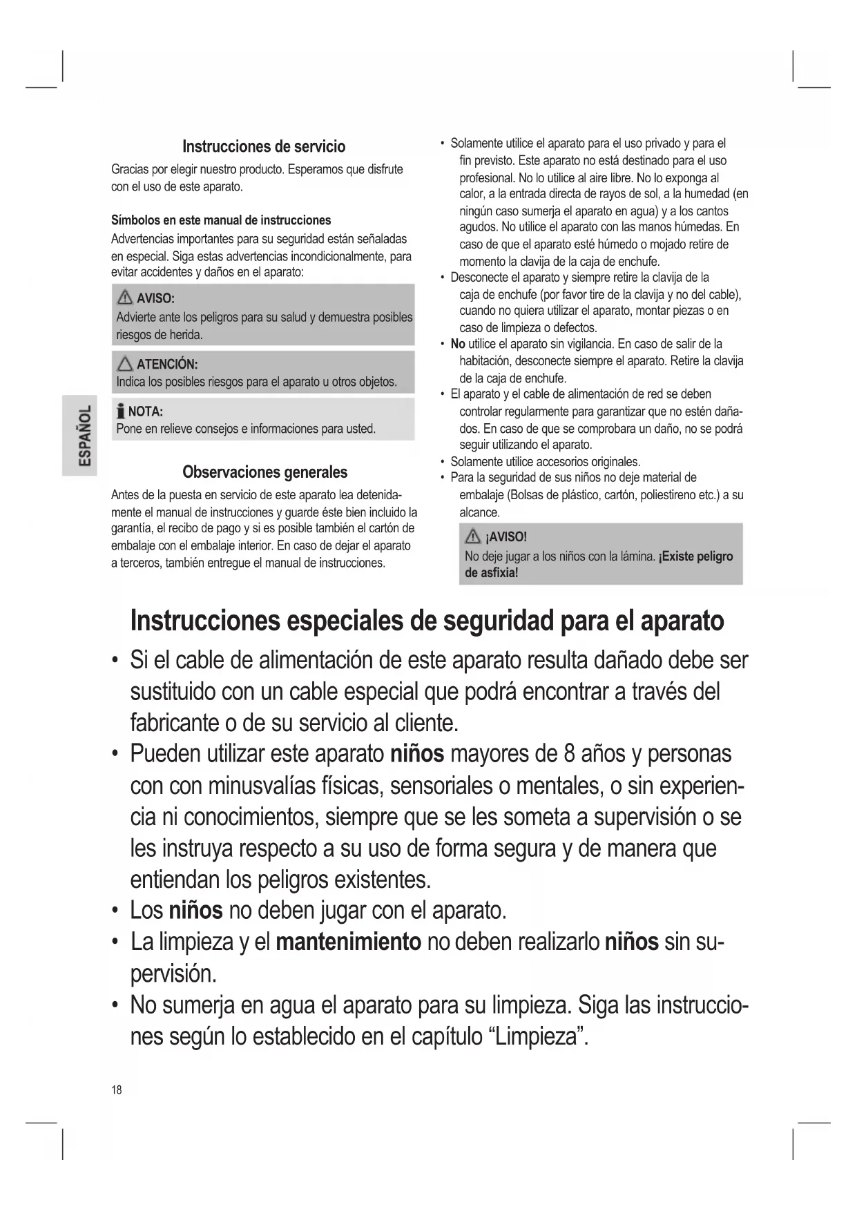 - Para la seguridad de sus niños no deje material de embalaje (Bolsas de plástico, cartón, poliestireno etc.) a su alcance. ¡AVISO! No deje jugar a los niños con la lámina. ¡Existe peligro de asxia! Instrucciones especiales de seguridad para el aparato