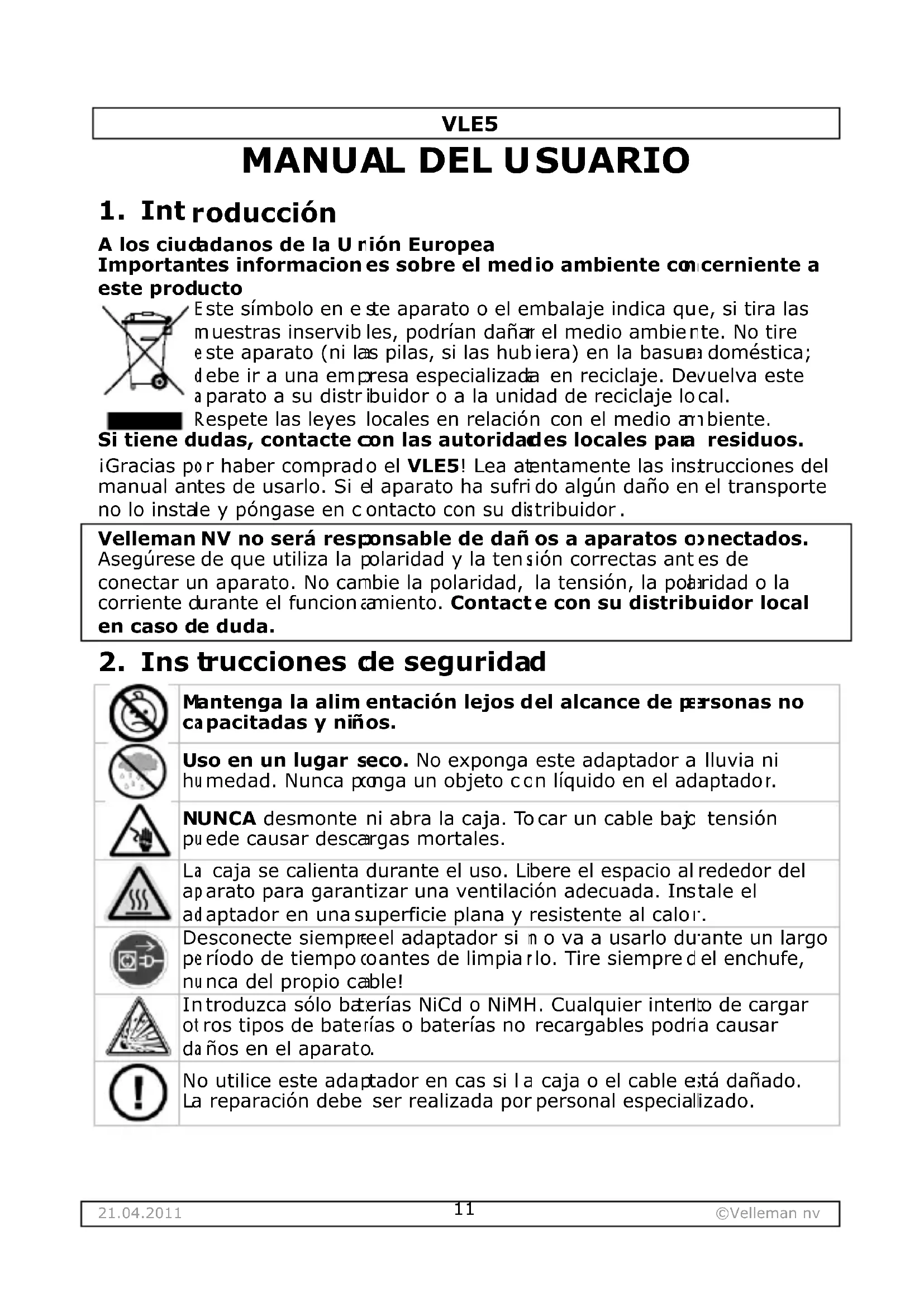 Descarga las instrucciones para tu Cargador de batería en formato PDF gratis! Encuentra tus instrucciones VLE5 - VELLEMAN y toma tu dispositivo electrónico nuevamente en la mano. En esta página están publicados todos los documentos necesarios para el uso de su dispositivo. VLE5 de la marca VELLEMAN.