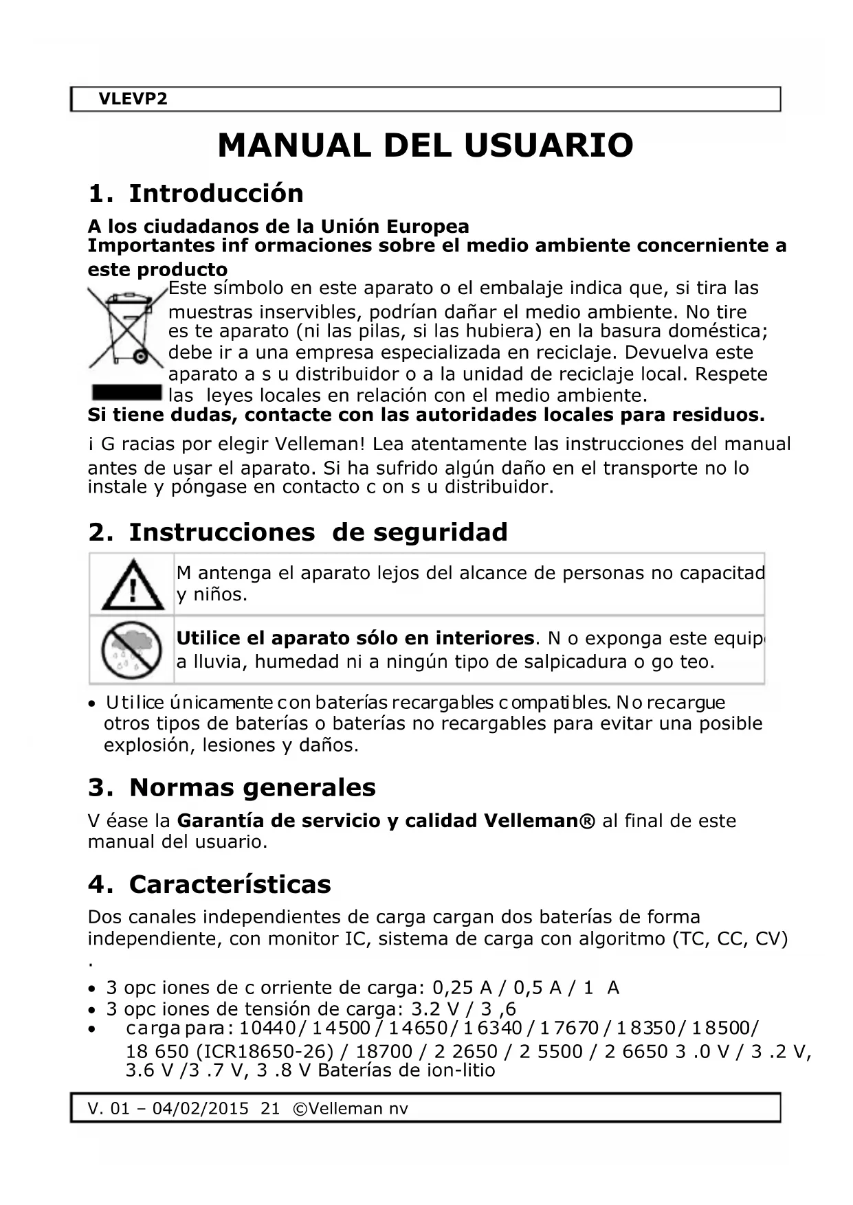 Descarga las instrucciones para tu Cargador de batería en formato PDF gratis! Encuentra tus instrucciones VLEVP2 - VELLEMAN y toma tu dispositivo electrónico nuevamente en la mano. En esta página están publicados todos los documentos necesarios para el uso de su dispositivo. VLEVP2 de la marca VELLEMAN.