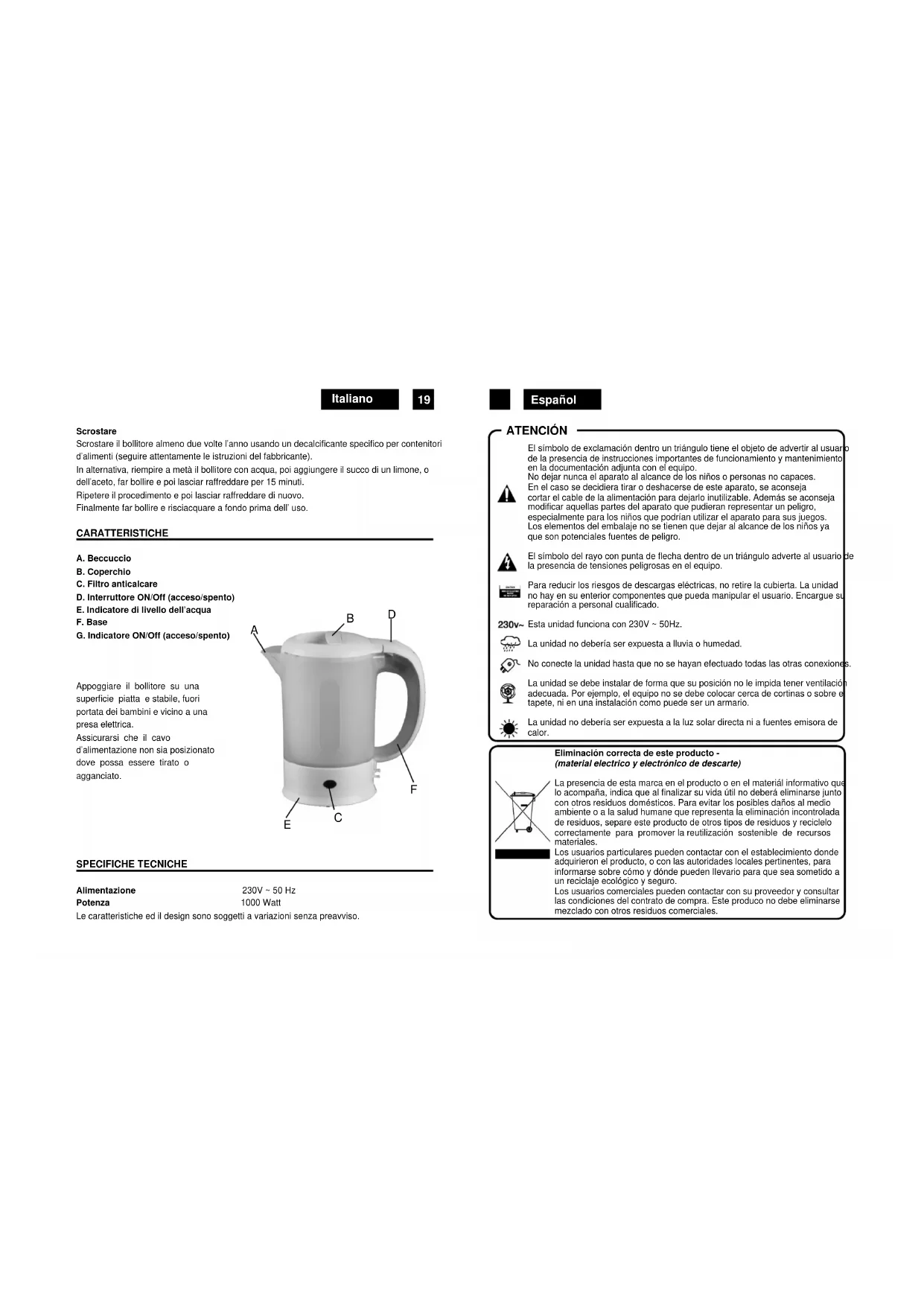 Limpieza Despegar de la corriente antes de limpiar. Usar un paño húmedo para limpiar el exterior del hervidor. Nunca use productos de limpieza químicos o abrasivos puesto porque pueden perjudicar el hervidor. Desconchar Desconchar el hervidor al menos dos veces al año usando un producto de descalcificación por recipientes por productos alimenticios, (seguir atentamente a las instrucciones del fabricante). En alternativa, llenar a medias el hervidor con agua, luego añadir el zumo de un limón, o vinagre, hacer hervir y luego dejar enfriar por 15 minutos. Repetir el procedimiento y luego dejar enfriar otra vez acer hervir y aclarar a fondo primera del empleo. CARACTERÍSTICAS A. Pitón B. Tapadera abisagrado C. Indicador (encendido / apagado) D. Interruptor(encendido / apagado) E. Base F. manejar Apoyar el hervidor en una superficie plana y estable, fuera del alcance de los niños y cerca de un enchufe eléctrico. Asegurarse que el cable de alimentación no sea posicionado donde pueda ser tirado o prendido.