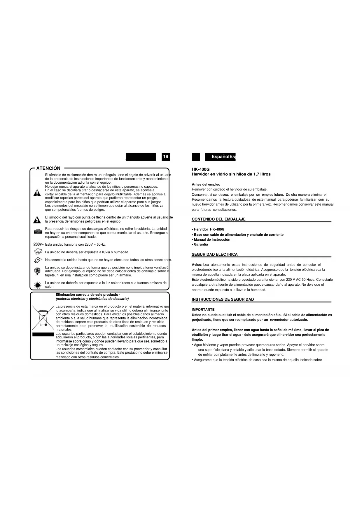 HK-400G Hervidor en vidrio sin hilos de 1,7 litros Antes del empleo Remover con cuidado el hervidor de su embalaje. Conservar, si se desea, el embalaje por un empleo futuro. De otra manera eliminar el Recomendamos la lectura cuidadosa de este manual para poderse familiarizar con su nuevo hervidor antes de utilizarlo por la primera vez. Recomendamos conservar este manual para futuras consultaciones.