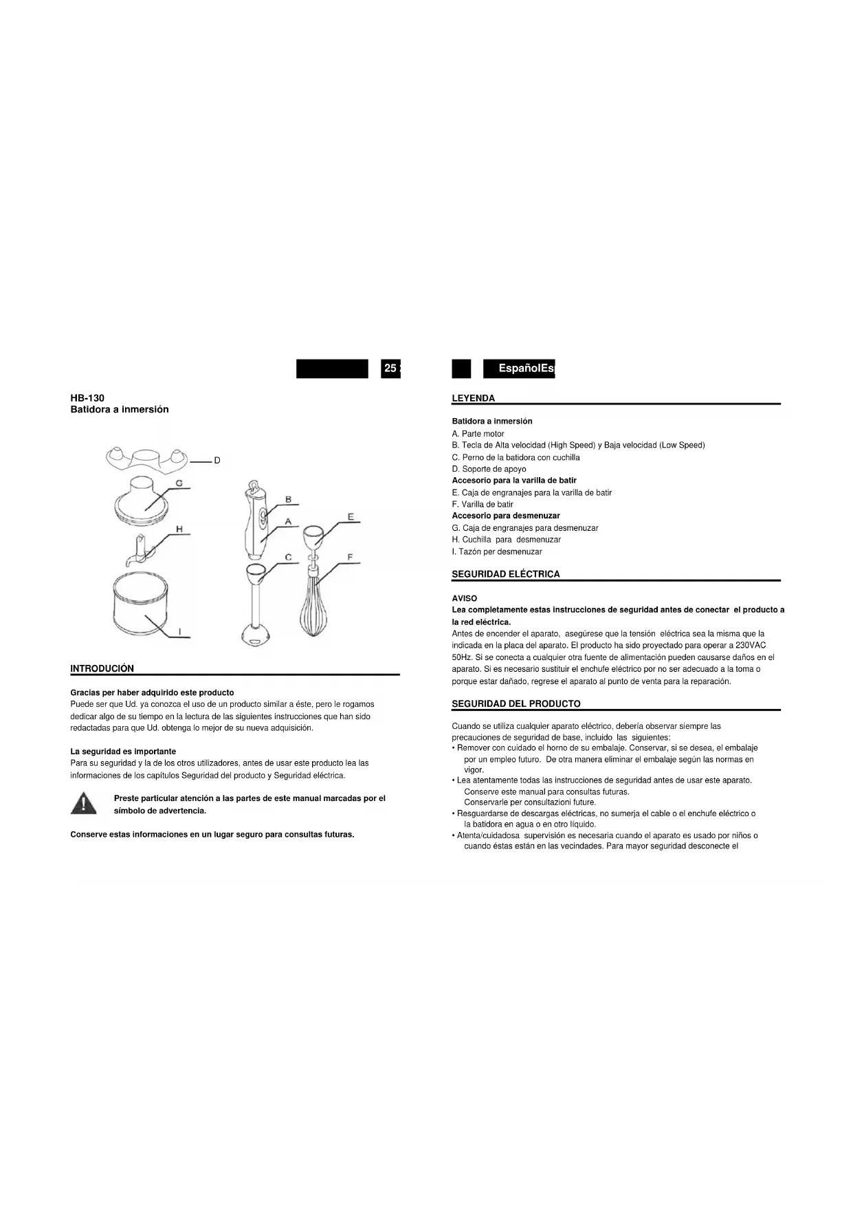 Conservarle per consulazioni future. - Resguardarse de descargas electricas, no sumeria el cable o el enchufe electrico o la batidora en agua o enanother liquido.