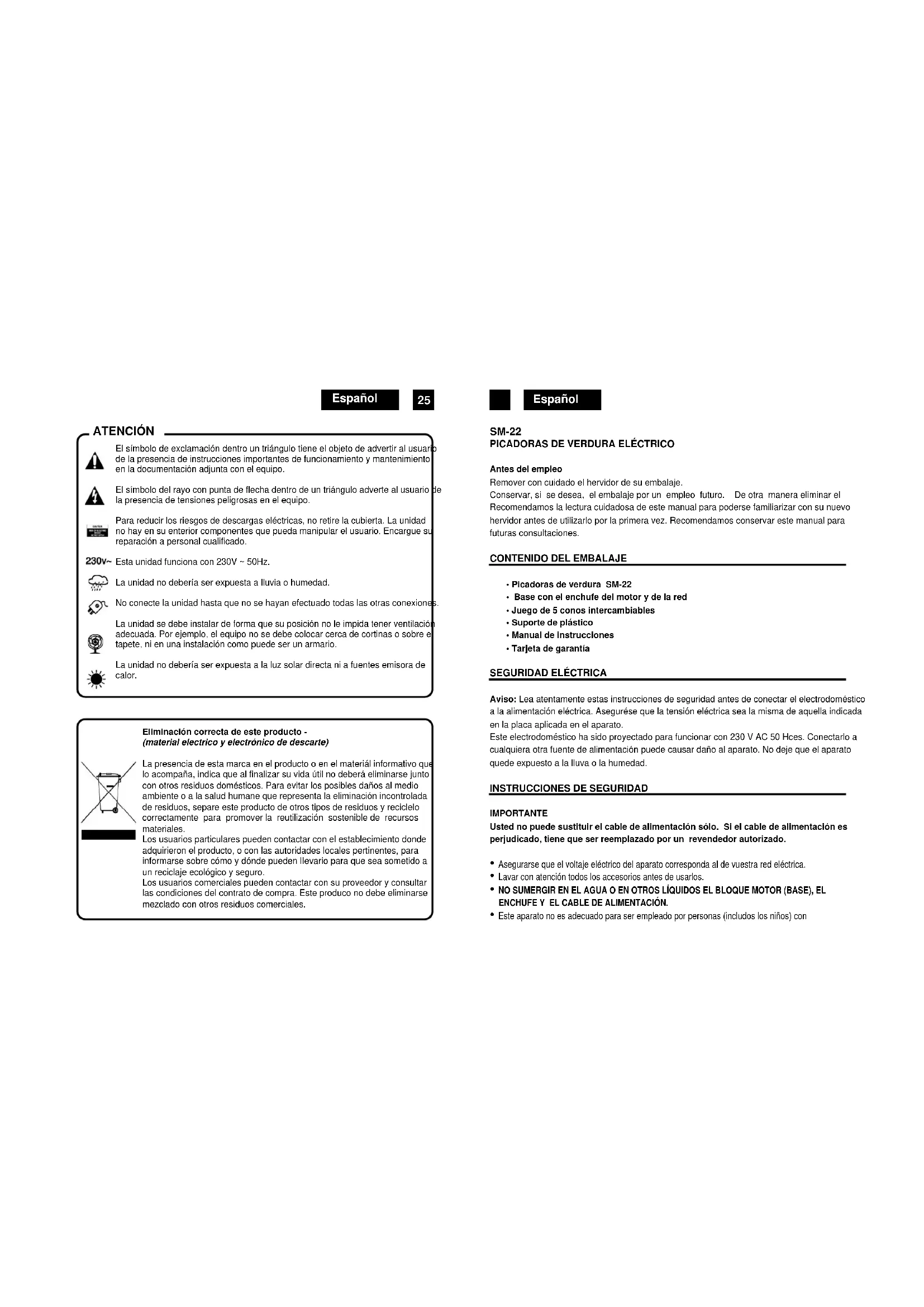- En el caso se decidepir tirar o deshacerse de este aparato, se aconseja cortar el cable de la alimentacion para partir lo inutilizable. Ademas se aconseja modifier aquellas partes del aparato que pudieran representar un peligro, especially para los niños que podrnan utilizing el aparato para sus juegos.
