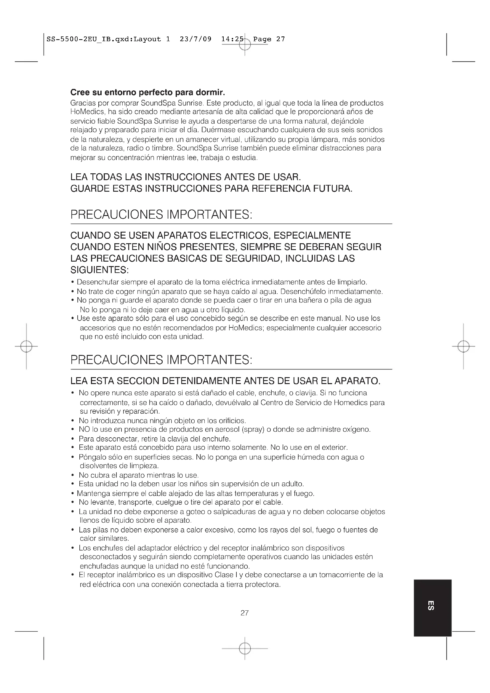 SS-5500-2EU_IB.qxd:Layout 1 23/7/09 14:25 Page 2627 Cree su entorno perfecto para dormir. Gracias por comprar SoundSpa Sunrise. Este producto, al igual que toda la línea de productos HoMedics, ha sido creado mediante artesanía de alta calidad que le proporcionará años de servicio fiable SoundSpa Sunrise le ayuda a despertarse de una forma natural, dejándole relajado y preparado para iniciar el día. Duérmase escuchando cualquiera de sus seis sonidos de la naturaleza, y despierte en un amanecer virtual, utilizando su propia lámpara, más sonidos de la naturaleza, radio o timbre. SoundSpa Sunrise también puede eliminar distracciones para mejorar su concentración mientras lee, trabaja o estudia. LEA TODAS LAS INSTRUCCIONES ANTES DE USAR. GUARDE ESTAS INSTRUCCIONES PARA REFERENCIA FUTURA. PRECAUCIONES IMPORTANTES: