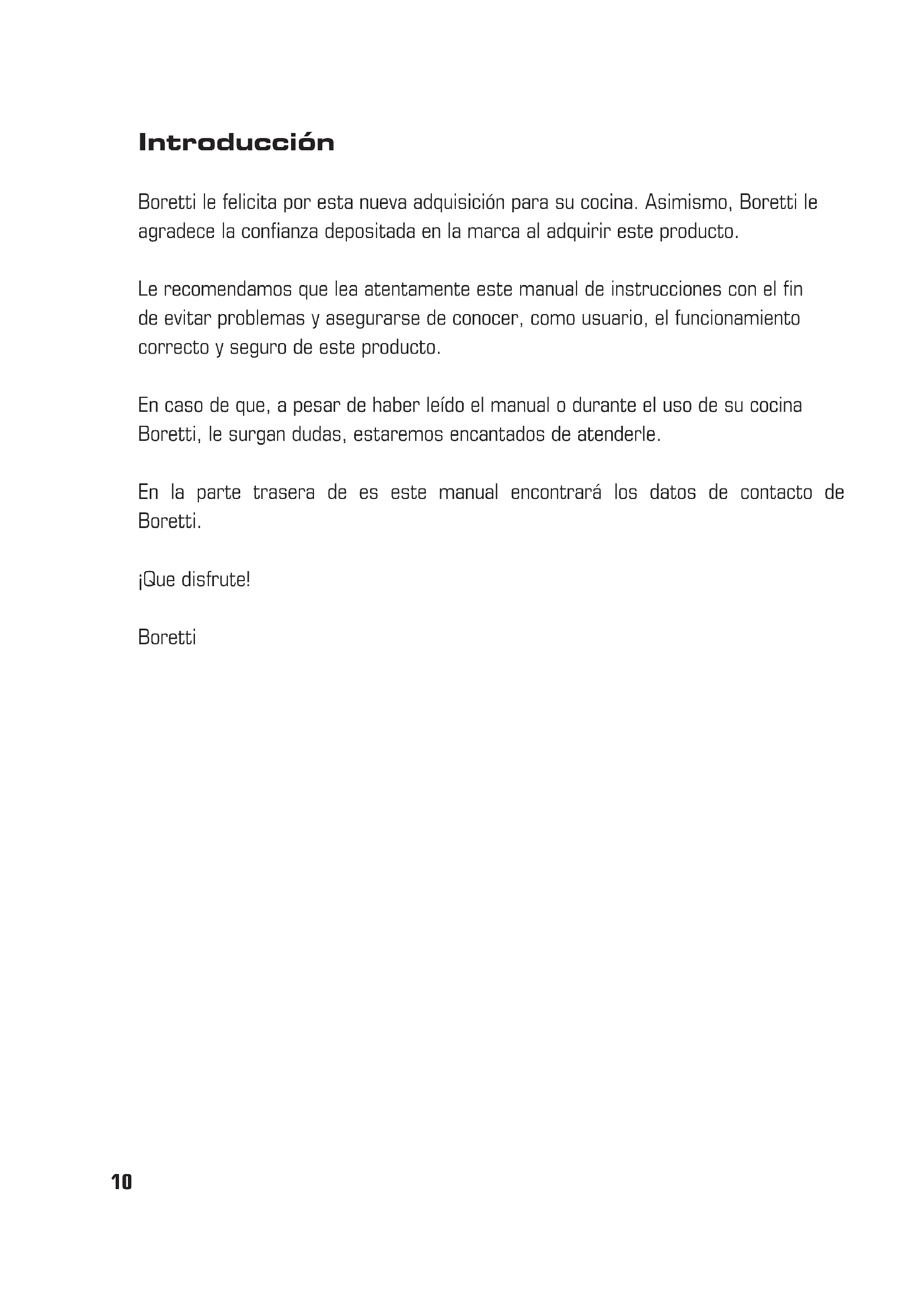 Mantenimiento Antes de cualquier trabajo de mantenimiento desconectar la campana de la corriente. Limpieza La campana debe ser limpiada con frecuencia tanto externamente como internamente. Para limpiarla use un paño empapado de alcohol desnaturalizado y detergentes líquidos neu- tros. Evite el uso de productos que contengan abrasivos. Atención: Si no se respetan las normas de limpieza de la campana y del cambio y limpieza de los filtros puede haber riesgo de incendio. Rogamos se atenga a las instrucciones indicadas. Filtro antigrasa: Tiene que ser limpiado una vez al mes, con de- tergentes no agresivos, manualmente o en el lavavajillas a temperaturas bajas y con un ciclo de lavado breve. Con el lavado en el lavavajilla el filtro antigrasa metálico puede desteñirse pero sus características de filtrado no cambian ab- solutamente. Filtro al carbòn (solo para la versiòn filtrante) El filtro a los carbones activos F no es ni lavable ni regenerable. El filtro al carbón tiene que ser reemplazado cada 4 meses cuando la campana se usa normalmente. Retiene los malos olores derivantes de la cocciòn. Substituciòn làmparas Atención! Antes de tocar la bombilla, com- pruebe que está fría. Extraiga cuidadosamente el cristal de la bombilla con un destornillador (consulte las ilustraciones de las últimas pági- nas). Sustituya la bombilla rota. Use sólo bom- billas halógenas de 20W como máximo y no las toque con la mano desnuda. A continuación, vuelva a colocar el cristal de la bombilla. Advertencias No use nunca la campana sin haber montado correctamente la rejilla. El aire aspirado no debe ser canalizado en un conducto usado para la descarga de humos de aparatos alimentados con energía que no sea eléctrica.Hay que reali- zar anteriormente una adecuada aireación del local cuando se usen al mismo tiempo la cam- pana y los aparatos alimentados con otra ener- gía que no sea eléctrica. Está rigurosamente prohibido cocinar alimentos a la llama debajo de la campana. El empleo de la llama libre daña los filtros y puede provocar incendios, por lo tanto debe evitarse en cualquier caso. Cuando se fríen los alimentos se debe tener cuidado de que el aceite no se caliente en exceso y se incendie. Para las medidas técnicas y de segu- ridad que haya que adoptar para la descarga de los humos aténgase rigurosamente a lo que diga el reglamento de las autoridades locales competentes.14 Introduction Boretti would like to congratulate you on your new kitchen purchase, and to thank you for choosing a Boretti brand product. Please read this manual carefully before going on to use the product. This will prevent possible problems and ensure that you are aware of the correct and safe use of this product In the event that queries arise once you have read the manual or at any time during the use of your Boretti product, we will be happy to help you. Please refer to the back cover of this manual for Boretti’s contact details. We hope you enjoy the product! BorettiNL