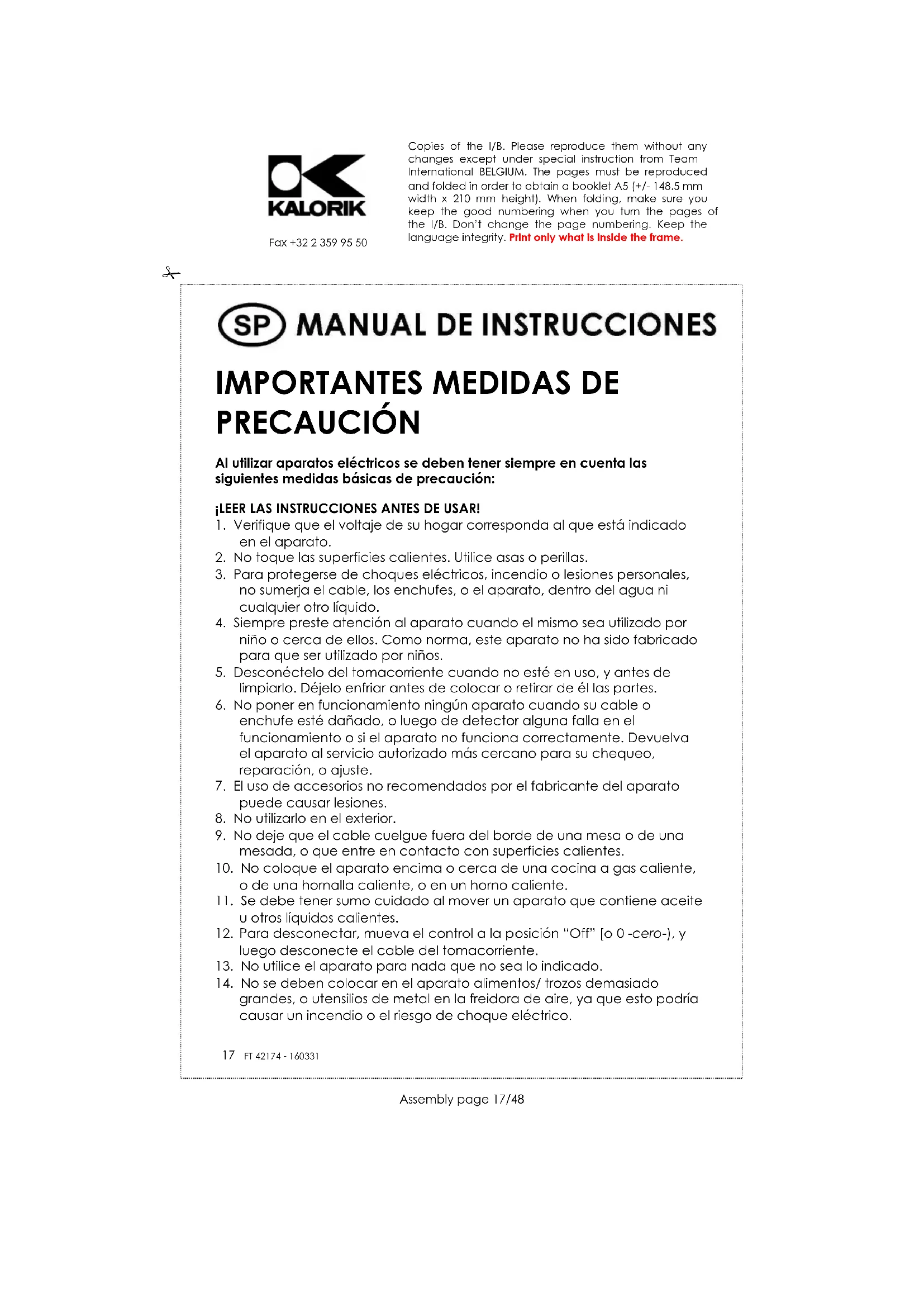 Fax +32 2 359 95 50 GARANTÍA Le sugerimos rellenen y nos envíen rápidamente la Tarjeta de Registro de Producto adjunta para facilitar la verificación de la fecha de compra. Por lo tanto, la devolución de esa Tarjeta de Registro de Producto no es una condición imprescindible para la aplicación de esa garantía. Puede también rellenar dicha tarjeta de garantía en línea en la dirección siguiente: www.KALORIK.com A partir de la fecha de compra, este producto KALORIK está garantizado un año contra los defectos materiales y de fabricación, en los Estados Unidos. Esta garantía no es transferible. Conserve la prueba de compra original. Se exige una prueba de compra para obtener la aplicación de la garantía. Durante este período, si el producto KALORIK después de una inspección por parte de KALORIK, se manifiesta defectuoso, será reparado o remplazado, según lo que decida KALORIK, sin gastos para el consumidor. Si se envía un producto de remplazo, se aplicará la garantía que queda del producto original. Esta garantía no se aplica a los defectos causados por una mala utilización por parte del comprador o del usuario, o una negligencia al no respeto del manual de instrucciones KALORIK, o una utilización en un circuito eléctrico cuyo voltaje es diferente al que figura en el producto, o un desgaste normal, o modificaciones o reparaciones no autorizadas por KALORIK, o por un uso con fines comerciales. No existe garantía por las partes de cristal, jarras de cristal, filtros, cestos, cuchillas y accesorios en general. No existe tampoco garantía por las piezas perdidas por el usuario. Toda garantía de valor comercial o de adaptabilidad a este producto está limitada a un año también. Algunos estados no ponen límites a la duración de la garantía tácita o no autorizan la exclusión de daños y perjuicios accesorios o indirectos, por lo que puede que las restricciones anteriormente mencionadas no le sean aplicables a Usted. Esta garantía le otorga derechos legales particulares, pero usted puede tener también otro