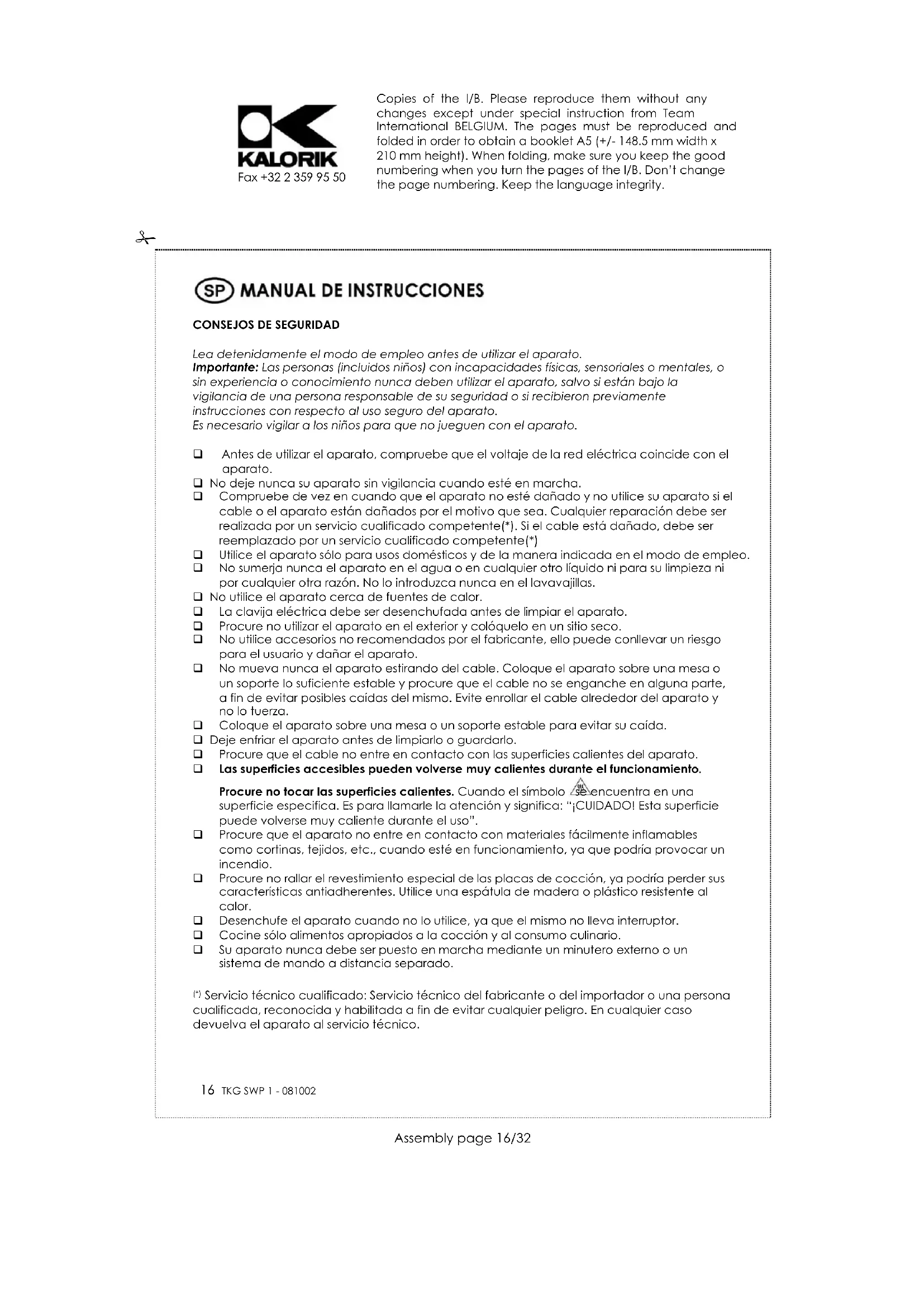 Fax +32 2 359 95 50 Deje ambas placas en posición horizontal y una al lado de la otra, para aumentar su superficie de cocción. Función Panini Esta función permite cocer alimentos o bocadillos (o paninis) en ambos lados presionando los alimentos a cocer entre ambas placas. LIMPIEZA Tras el empleo y antes de su limpieza, desenchufe el aparato y déjelo enfriar. Limpie el exterior del aparato con la ayuda de un paño ligeramente humedecido, asegurándose de que no haya humedad, aceite o grasa que se infiltre en las aeraciones que enfrían el aparato. Para retirar la placa superior, presione el botón de desbloqueo (6) y retirar la placa tirándola hacia usted. Esta placa se pone de nuevo sujetando primero las uñas de fixación y luego presionando en ellas hasta que el botón de desbloqueo haga un clic. Para retirar la placa inferior, presione el botón de desbloqueo (11). Si las deja en el aparato, limpie las placas con la ayuda de un papel absorbente o de un paño suave (nunca con un estropajo). Si las quita del aparato puede lavarlas con agua corriente. Séquenles cuidadosamente. No las ponga en el lavavajillas. Puede también retirar la bandeja recogegrasas situada en la parte trasera del aparato. Manténgala bien horizontalmente, tírela y límpiela con agua jabonosa. Nunca limpie ni el interior ni el exterior con productos abrasivos ya que estos estropean el revestimiento antiadherente. No utilice utensilios metálicos o puntiagudos puesto que podrían dañar el revestimiento anti adhesivo del aparato. Nunca introduzca el aparato en el agua u otro líquido. PROTECCIÓN DEL MEDIO AMBIENTE –DIRECTIVA 2002/96/CE Para poder preservar nuestro medio ambiente y proteger la salud humana, los residuos eléctricos y equipos electrónicos deberían ser destruidos de acuerdo con unas normas especificas con la implicación de ambos proveedores y consumidores. Por esta razón, como indica el símbolo en la placa de datos técnicos, su aparato no debería ser tirado en un contenedor municipal sino que debería ser devuelto a la tienda, o dejado en un punto de recolección para ser reciclado o usado para otras aplicaciones conforme a la directiva. Copies of the I/B. Please reproduce them without any changes except under special instruction from Team International BELGIUM. The pages must be reproduced and folded in order to obtain a booklet A5 (+/- 148.5 mm width x 210 mm height). When folding, make sure you keep the good numbering when you turn the pages of the I/B. Don’t change the page numbering. Keep the language integrity.