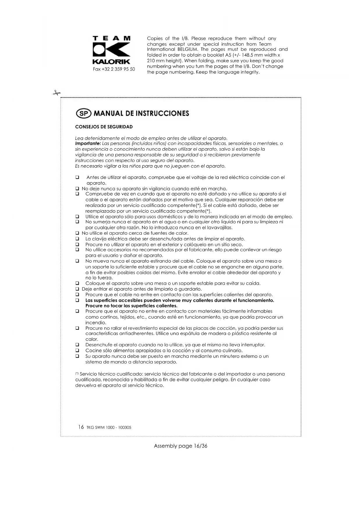 Fax +32 2 359 95 50 LIMPIEZA Tras el empleo y antes de su limpieza, desenchufe el aparato y déjelo enfriar. Limpie el exterior del aparato con la ayuda de un paño ligeramente humedecido, asegurándose de que no haya humedad, aceite o grasa que se infiltre en las aeraciones que enfrían el aparato. Para limpiar las placas, Usted puede dejarlas en el aparato o sacarlas (para ello, presione sobre el botón 2 situado cerca del mango y quítelas (ver dibujo)). Si las deja en el aparato, limpie las placas con la ayuda de un papel absorbente o de un paño suave (nunca con un estropajo). Si las quita del aparato puede lavarlas con agua corriente con ayuda de una esponja (nunca con un estropajo). Nunca limpie ni el interior ni el exterior con productos abrasivos ya que estos estropean el revestimiento antiadherente. Nunca introduzca el aparato en el agua u otro líquido. PROTECCIÓN DEL MEDIO AMBIENTE – DIRECTIVA 2002/96/CE Para poder preservar nuestro medio ambiente y proteger la salud humana, los residuos eléctricos y equipos electrónicos deberían ser destruidos de acuerdo con unas normas especificas con la implicación de ambos proveedores y consumidores. Por esta razón, como indica el símbolo en la placa de datos técnicos, su aparato no debería ser tirado en un contenedor municipal sino que debería ser devuelto a la tienda, o dejado en un punto de recolección para ser reciclado o usado para otras aplicaciones conforme a la directiva. Copies of the I/B. Please reproduce them without any changes except under special instruction from Team International BELGIUM. The pages must be reproduced and folded in order to obtain a booklet A5 (+/- 148.5 mm width x 210 mm height). When folding, make sure you keep the good numbering when you turn the pages of the I/B. Don’t change the page numbering. Keep the language integrity.