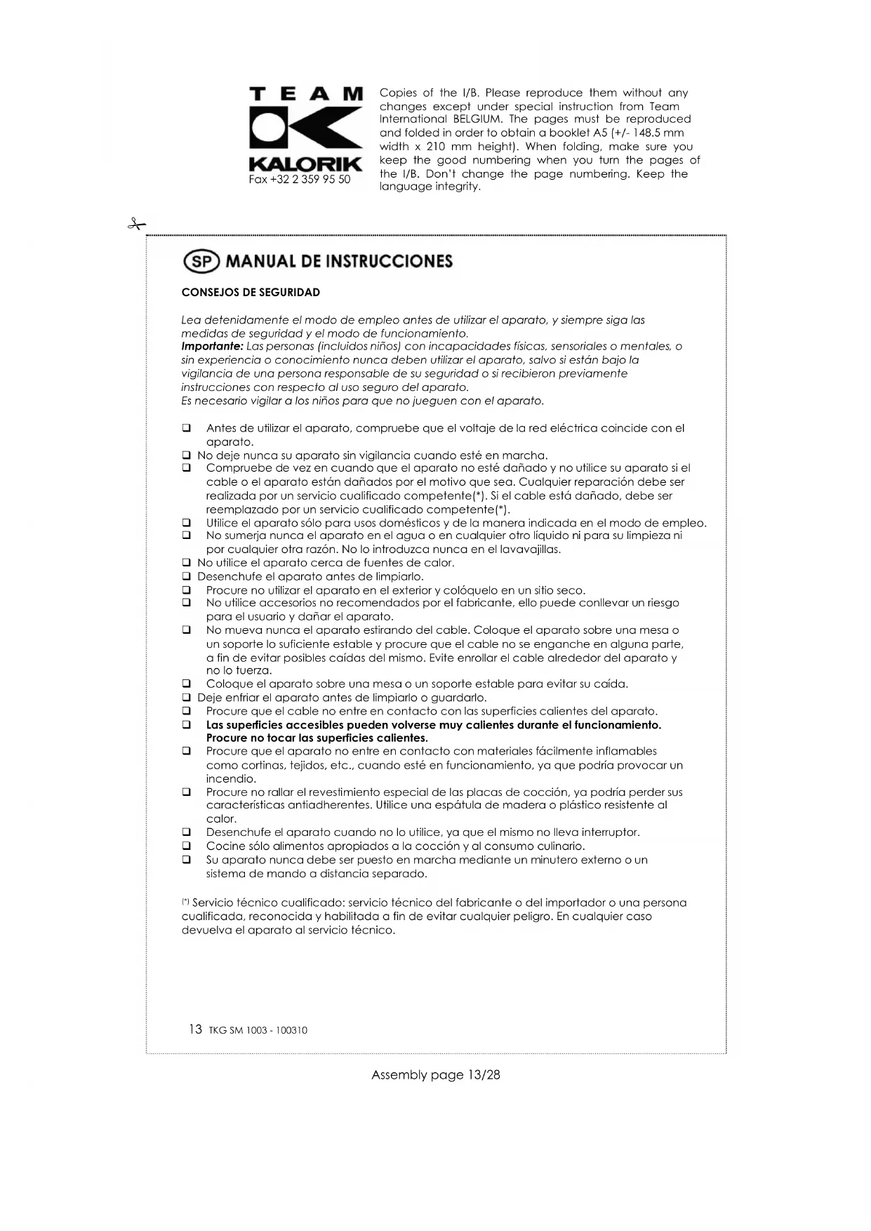 Fax +32 2 359 95 50 PROTECCIÓN DEL MEDIO AMBIENTE – DIRECTIVA 2002/96/CE Para poder preservar nuestro medio ambiente y proteger la salud humana, los residuos eléctricos y equipos electrónicos deberían ser destruidos de acuerdo con unas normas especificas con la implicación de ambos proveedores y consumidores. Por esta razón, como indica el símbolo en la placa de datos técnicos, su aparato no debería ser tirado en un contenedor municipal sino que debería ser devuelto a la tienda, o dejado en un punto de recolección para ser reciclado o usado para otras aplicaciones conforme a la directiva. Copies of the I/B. Please reproduce them without any changes except under special instruction from Team International BELGIUM. The pages must be reproduced and folded in order to obtain a booklet A5 (+/- 148.5 mm width x 210 mm height). When folding, make sure you keep the good numbering when you turn the pages of the I/B. Don’t change the page numbering. Keep the language integrity.