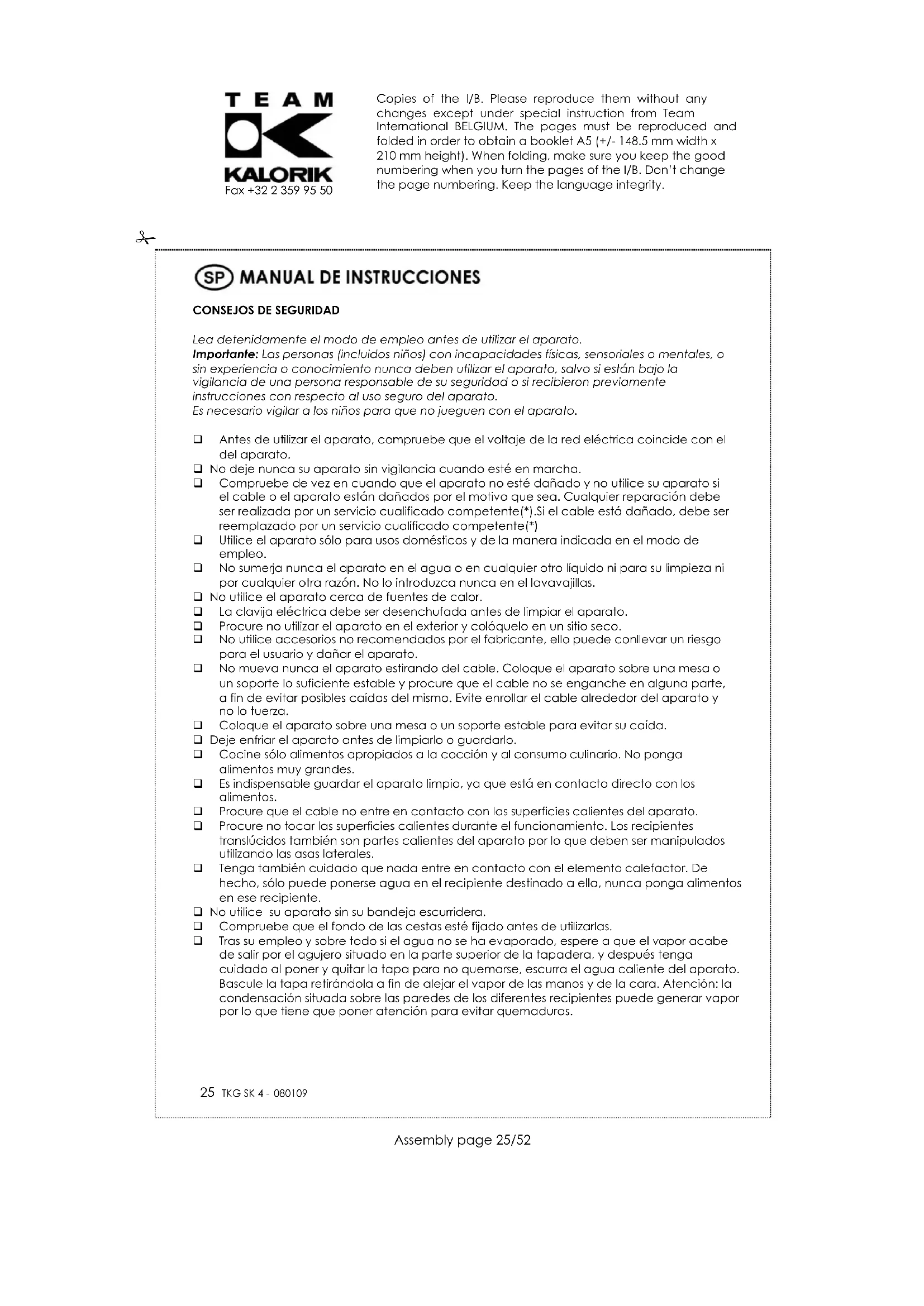 Lea detenidamente el modo de empleo antes de utilizar el aparato. Importante: Las personas (incluidos niños) con incapacidades físicas, sensoriales o mentales, o sin experiencia o conocimiento nunca deben utilizar el aparato, salvo si están bajo la vigilancia de una persona responsable de su seguridad o si recibieron previamente instrucciones con respecto al uso seguro del aparato. Es necesario vigilar a los niños para que no jueguen con el aparato. Antes de utilizar el aparato, compruebe que el voltaje de la red eléctrica coincide con el del aparato. No deje nunca su aparato sin vigilancia cuando esté en marcha. Compruebe de vez en cuando que el aparato no esté dañado y no utilice su aparato si el cable o el aparato están dañados por el motivo que sea. Cualquier reparación debe ser realizada por un servicio cualificado competente(*).Si el cable está dañado, debe ser reemplazado por un servicio cualificado competente(*) Utilice el aparato sólo para usos domésticos y de la manera indicada en el modo de empleo. No sumerja nunca el aparato en el agua o en cualquier otro líquido ni para su limpieza ni por cualquier otra razón. No lo introduzca nunca en el lavavajillas. No utilice el aparato cerca de fuentes de calor. La clavija eléctrica debe ser desenchufada antes de limpiar el aparato. Procure no utilizar el aparato en el exterior y colóquelo en un sitio seco. No utilice accesorios no recomendados por el fabricante, ello puede conllevar un riesgo para el usuario y dañar el aparato. No mueva nunca el aparato estirando del cable. Coloque el aparato sobre una mesa o un soporte lo suficiente estable y procure que el cable no se enganche en alguna parte, a fin de evitar posibles caídas del mismo. Evite enrollar el cable alrededor del aparato y no lo tuerza. Coloque el aparato sobre una mesa o un soporte estable para evitar su caída. Deje enfriar el aparato antes de limpiarlo o guardarlo. Cocine sólo alimentos apropiados a la cocción y al consumo culinario. No ponga alimentos muy grandes. Es indispensable guardar el aparato limpio, ya que está en contacto directo con los alimentos. Procure que el cable no entre en contacto con las superficies calientes del aparato. Procure no tocar las superficies calientes durante el funcionamiento. Los recipientes translúcidos también son partes calientes del aparato por lo que deben ser manipulados utilizando las asas laterales. Tenga también cuidado que nada entre en contacto con el elemento calefactor. De hecho, sólo puede ponerse agua en el recipiente destinado a ella, nunca ponga alimentos en ese recipiente. No utilice su aparato sin su bandeja escurridera. Compruebe que el fondo de las cestas esté fijado antes de utilizarlas. Tras su empleo y sobre todo si el agua no se ha evaporado, espere a que el vapor acabe de salir por el agujero situado en la parte superior de la tapadera, y después tenga cuidado al poner y quitar la tapa para no quemarse, escurra el agua caliente del aparato. Bascule la tapa retirándola a fin de alejar el vapor de las manos y de la cara. Atención: la condensación situada sobre las paredes de los diferentes recipientes puede generar vapor por lo que tiene que poner atención para evitar quemaduras. Copies of the I/B. Please reproduce them without any changes except under special instruction from Team International BELGIUM. The pages must be reproduced and folded in order to obtain a booklet A5 (+/- 148.5 mm width x 210 mm height). When folding, make sure you keep the good numbering when you turn the pages of the I/B. Don’t change the page numbering. Keep the language integrity.