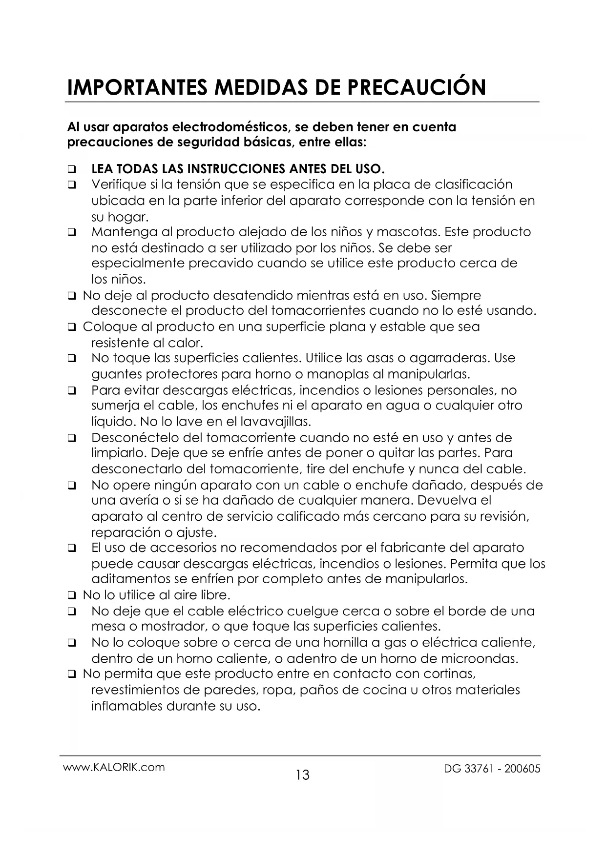 Al usar aparatos electrodomésticos, se deben tener en cuenta precauciones de seguridad básicas, entre ellas: ❑ LEA TODAS LAS INSTRUCCIONES ANTES DEL USO. ❑ Verifique si la tensión que se especifica en la placa de clasificación ubicada en la parte inferior del aparato corresponde con la tensión en su hogar. ❑ Mantenga al producto alejado de los niños y mascotas. Este producto no está destinado a ser utilizado por los niños. Se debe ser especialmente precavido cuando se utilice este producto cerca de los niños. ❑ No deje al producto desatendido mientras está en uso. Siempre desconecte el producto del tomacorrientes cuando no lo esté usando. ❑ Coloque al producto en una superficie plana y estable que sea resistente al calor. ❑ No toque las superficies calientes. Utilice las asas o agarraderas. Use guantes protectores para horno o manoplas al manipularlas. ❑ Para evitar descargas eléctricas, incendios o lesiones personales, no sumerja el cable, los enchufes ni el aparato en agua o cualquier otro líquido. No lo lave en el lavavajillas. ❑ Desconéctelo del tomacorriente cuando no esté en uso y antes de limpiarlo. Deje que se enfríe antes de poner o quitar las partes. Para desconectarlo del tomacorriente, tire del enchufe y nunca del cable. ❑ No opere ningún aparato con un cable o enchufe dañado, después de una avería o si se ha dañado de cualquier manera. Devuelva el aparato al centro de servicio calificado más cercano para su revisión, reparación o ajuste. ❑ El uso de accesorios no recomendados por el fabricante del aparato puede causar descargas eléctricas, incendios o lesiones. Permita que los aditamentos se enfríen por completo antes de manipularlos. ❑ No lo utilice al aire libre. ❑ No deje que el cable eléctrico cuelgue cerca o sobre el borde de una mesa o mostrador, o que toque las superficies calientes. ❑ No lo coloque sobre o cerca de una hornilla a gas o eléctrica caliente, dentro de un horno caliente, o adentro de un horno de microondas. ❑ No permita que este producto entre en contacto con cortinas, revestimientos de paredes, ropa, paños de cocina u otros materiales inflamables durante su uso.14