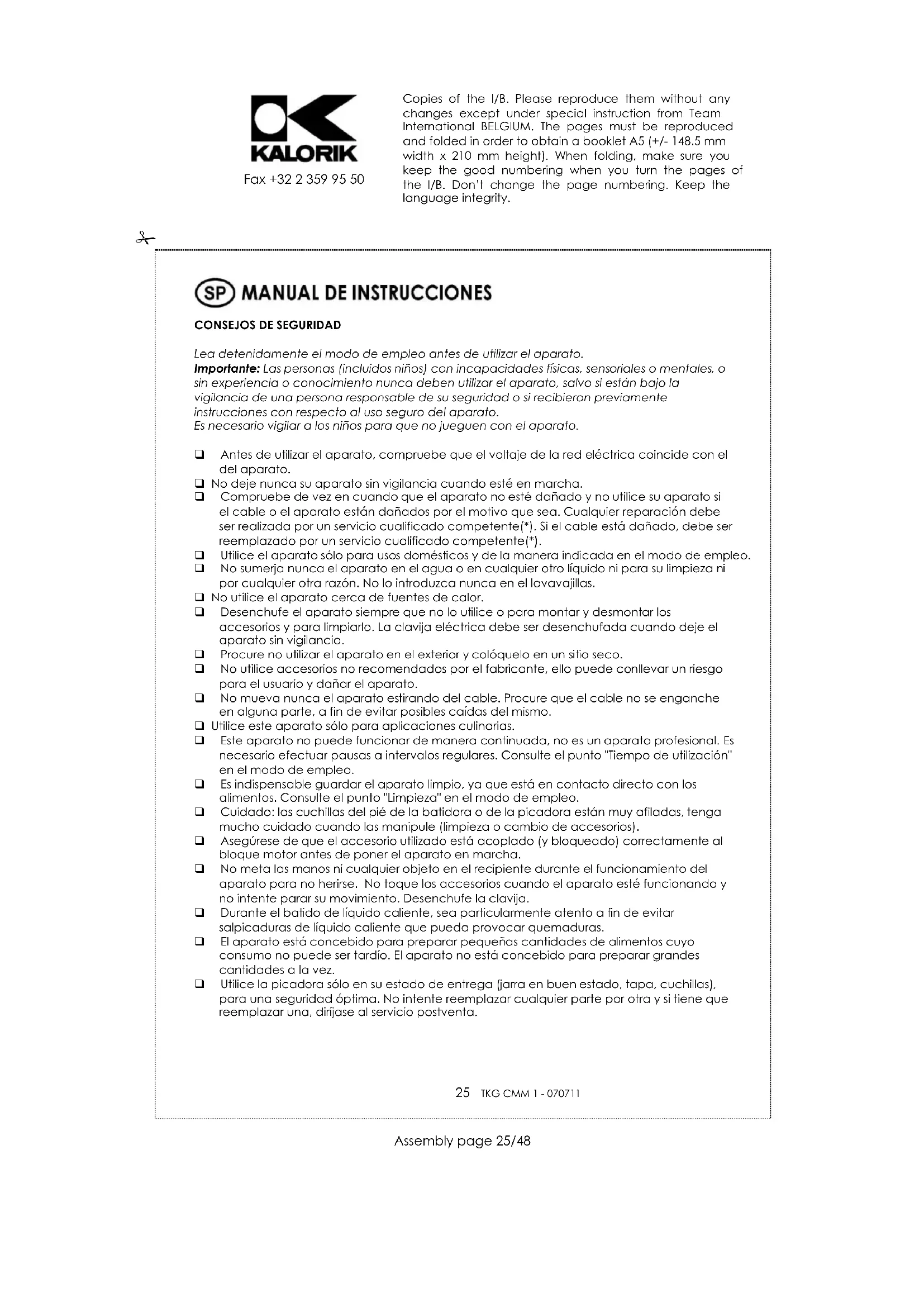 - Limpie la base con agua caliente y detergente. - Séquela con cuidado. CUANDO PREPARE ALIMENTOS CON COLORANTES (zanahorias por ejemplo), ES POSIBLE QUE ALGUNAS PARTES DEL APARATO CAMBIEN DE COLOR. PROTECCIÓN DEL MEDIO AMBIENTE –DIRECTIVA 2002/96/CE Para poder preservar nuestro medio ambiente y proteger la salud humana, los residuos eléctricos y equipos electrónicos deberían ser destruidos de acuerdo con unas normas especificas con la implicación de ambos proveedores y consumidores. Por esta razón, como indica el símbolo en la placa de datos técnicos, su aparato no debería ser tirado en un contenedor municipal sino que debería ser devuelto a la tienda, o dejado en un punto de recolección para ser reciclado o usado para otras aplicaciones conforme a la directiva. Copies of the I/B. Please reproduce them without any changes except under special instruction from Team International BELGIUM. The pages must be reproduced and folded in order to obtain a booklet A5 (+/- 148.5 mm width x 210 mm height). When folding, make sure you keep the good numbering when you turn the pages of the I/B. Don’t change the page numbering. Keep the language integrity.