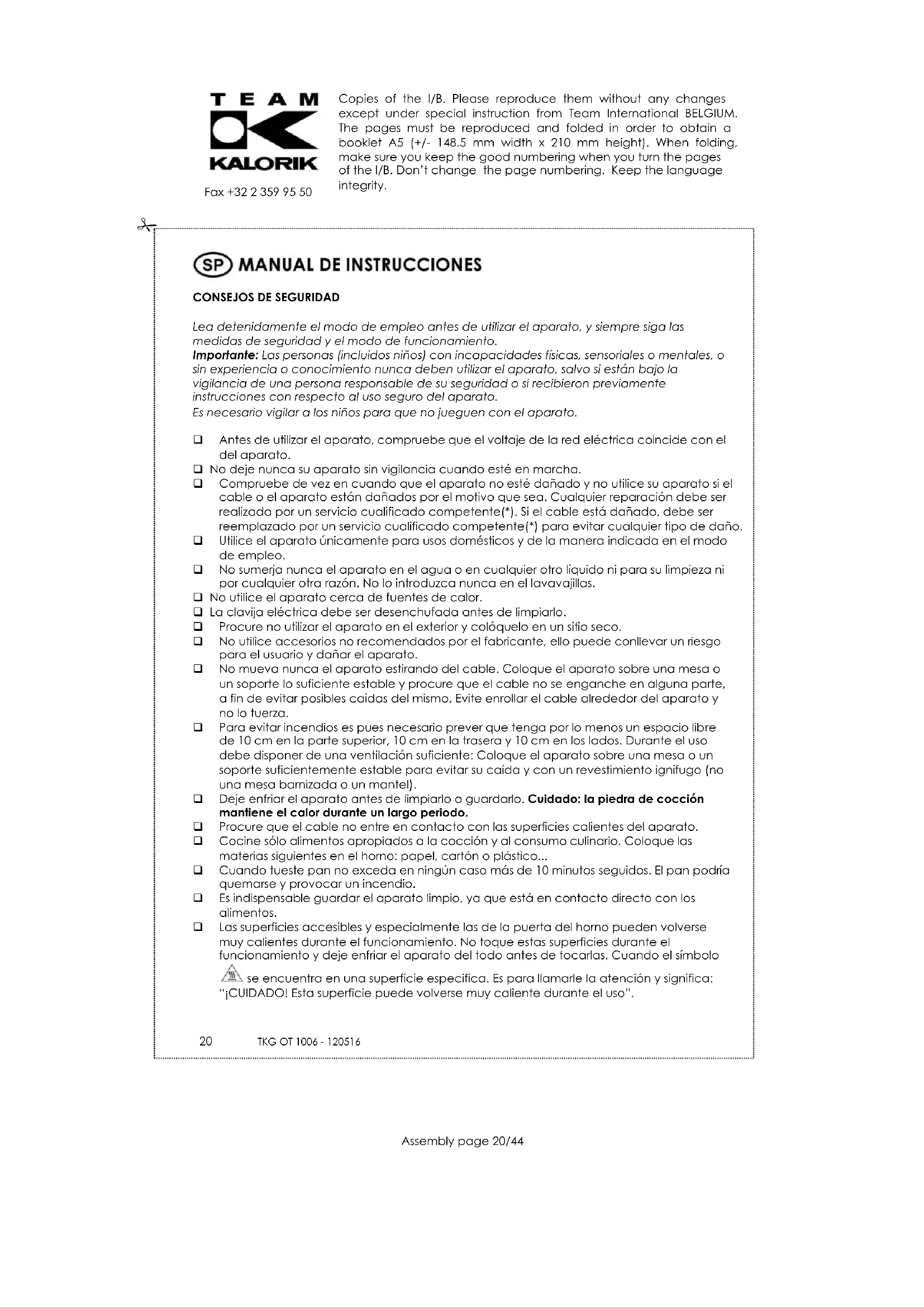 Lea detenidamente el modo de empleo antes de utilizar el aparato, y siempre siga las medidas de seguridad y el modo de funcionamiento. Importante: Las personas (incluidos niños) con incapacidades físicas, sensoriales o mentales, o sin experiencia o conocimiento nunca deben utilizar el aparato, salvo si están bajo la vigilancia de una persona responsable de su seguridad o si recibieron previamente instrucciones con respecto al uso seguro del aparato. Es necesario vigilar a los niños para que no jueguen con el aparato. Antes de utilizar el aparato, compruebe que el voltaje de la red eléctrica coincide con el del aparato. No deje nunca su aparato sin vigilancia cuando esté en marcha. Compruebe de vez en cuando que el aparato no esté dañado y no utilice su aparato si el cable o el aparato están dañados por el motivo que sea. Cualquier reparación debe ser realizada por un servicio cualificado competente(*). Si el cable está dañado, debe ser reemplazado por un servicio cualificado competente(*) para evitar cualquier tipo de daño. Utilice el aparato únicamente para usos domésticos y de la manera indicada en el modo de empleo. No sumerja nunca el aparato en el agua o en cualquier otro líquido ni para su limpieza ni por cualquier otra razón. No lo introduzca nunca en el lavavajillas. No utilice el aparato cerca de fuentes de calor. La clavija eléctrica debe ser desenchufada antes de limpiarlo. Procure no utilizar el aparato en el exterior y colóquelo en un sitio seco. No utilice accesorios no recomendados por el fabricante, ello puede conllevar un riesgo para el usuario y dañar el aparato. No mueva nunca el aparato estirando del cable. Coloque el aparato sobre una mesa o un soporte lo suficiente estable y procure que el cable no se enganche en alguna parte, a fin de evitar posibles caídas del mismo. Evite enrollar el cable alrededor del aparato y no lo tuerza. Para evitar incendios es pues necesario prever que tenga por lo menos un espacio libre de 10 cm en la parte superior, 10 cm en la trasera y 10 cm en los lados. Durante el uso debe disponer de una ventilación suficiente: Coloque el aparato sobre una mesa o un soporte suficientemente estable para evitar su caída y con un revestimiento ignífugo (no una mesa barnizada o un mantel). Deje enfriar el aparato antes de limpiarlo o guardarlo. Cuidado: la piedra de cocción mantiene el calor durante un largo periodo. Procure que el cable no entre en contacto con las superficies calientes del aparato. Cocine sólo alimentos apropiados a la cocción y al consumo culinario. Coloque las materias siguientes en el horno: papel, cartón o plástico... Cuando tueste pan no exceda en ningún caso más de 10 minutos seguidos. El pan podría quemarse y provocar un incendio. Es indispensable guardar el aparato limpio, ya que está en contacto directo con los alimentos. Las superficies accesibles y especialmente las de la puerta del horno pueden volverse muy calientes durante el funcionamiento. No toque estas superficies durante el funcionamiento y deje enfriar el aparato del todo antes de tocarlas. Cuando el símbolo se encuentra en una superficie especifica. Es para llamarle la atención y significa: “¡CUIDADO! Esta superficie puede volverse muy caliente durante el uso”.Copies of the I/B. Please reproduce them without any changes except under special instruction from Team International BELGIUM. The pages must be reproduced and folded in order to obtain a booklet A5 (+/- 148.5 mm width x 210 mm height). When folding, make sure you keep the good numbering when you turn the pages of the I/B. Don’t change the page numbering. Keep the language integrity.