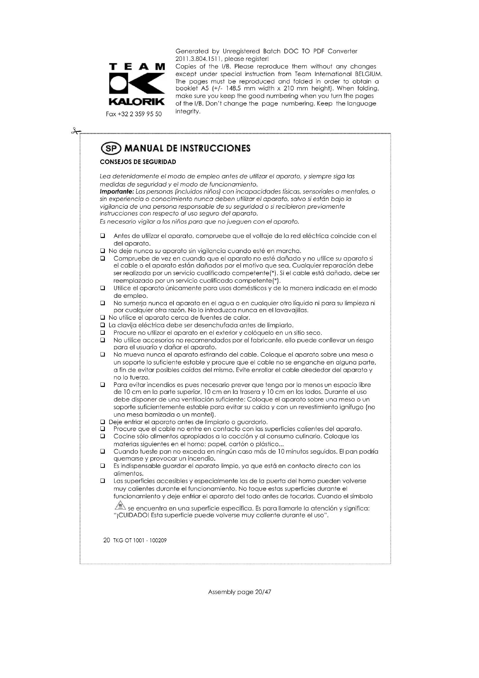 PROTECCIÓN DEL MEDIO AMBIENTE – DIRECTIVA 2002/96/CE Para poder preservar nuestro medio ambiente y proteger la salud humana, los residuos eléctricos y equipos electrónicos deberían ser destruidos de acuerdo con unas normas especificas con la implicación de ambos proveedores y consumidores. Por esta razón, como indica el símbolo en la placa de datos técnicos, su aparato no debería ser tirado en un contenedor municipal sino que debería ser devuelto a la tienda, o dejado en un punto de recolección para ser reciclado o usado para otras aplicaciones conforme a la directiva.Generated by Unregistered Batch DOC TO PDF Converter 2011.3.804.1511, please register! Copies of the I/B. Please reproduce them without any changes except under special instruction from Team International BELGIUM. The pages must be reproduced and folded in order to obtain a booklet A5 (+/- 148.5 mm width x 210 mm height). When folding, make sure you keep the good numbering when you turn the pages of the I/B. Don’t change the page numbering. Keep the language integrity.