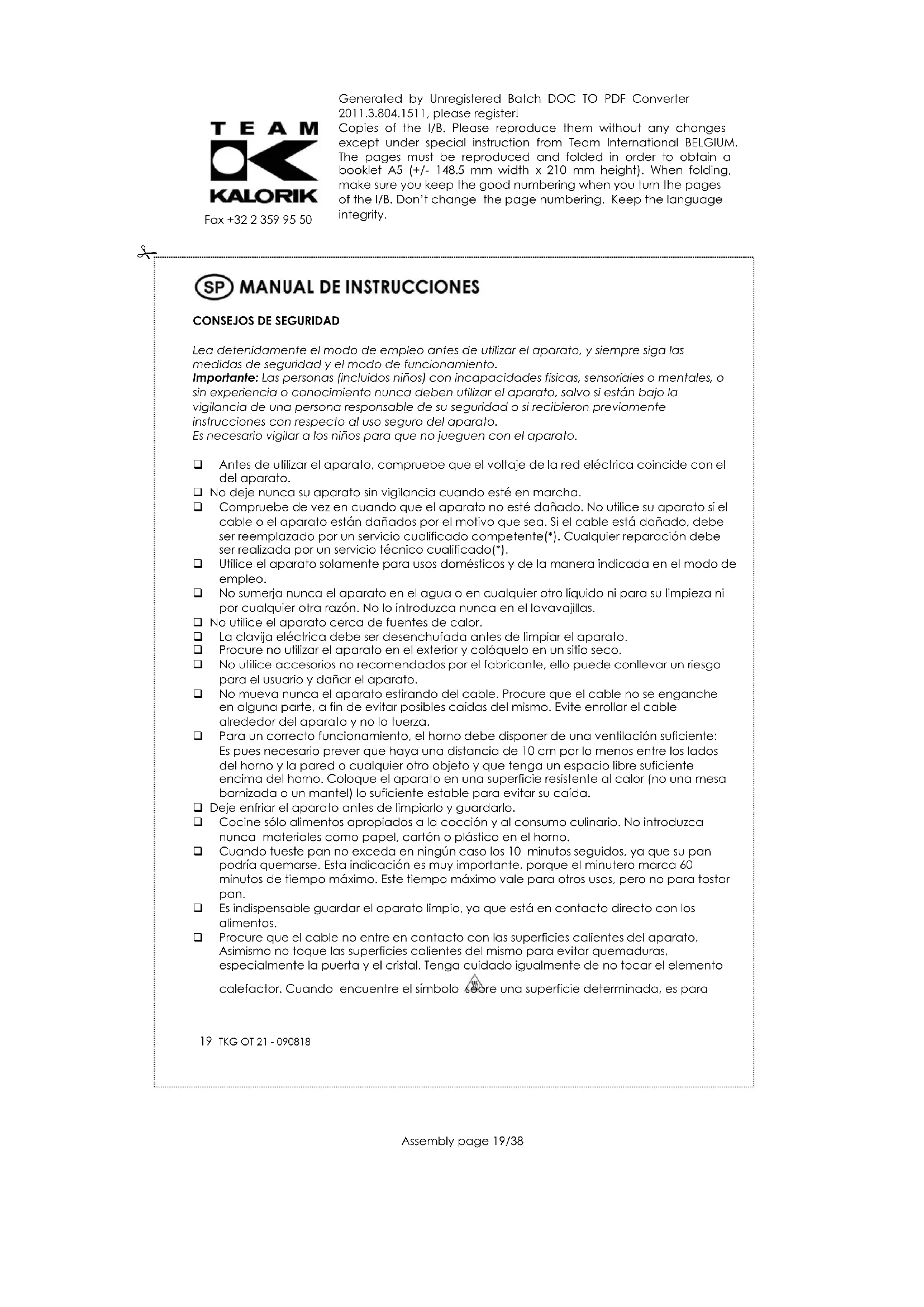 Para poder preservar nuestro medio ambiente y proteger la salud humana, los residuos eléctricos y equipos electrónicos deberían ser destruidos de acuerdo con unas normas especificas con la implicación de ambos proveedores y consumidores. Por esta razón, como indica el símbolo en la placa de datos técnicos, su aparato no debería ser tirado en un contenedor municipal sino que debería ser devuelto a la tienda, o dejado en un punto de recolección para ser reciclado o usado para otras aplicaciones conforme a la directiva.Generated by Unregistered Batch DOC TO PDF Converter 2011.3.804.1511, please register! Copies of the I/B. Please reproduce them without any changes except under special instruction from Team International BELGIUM. The pages must be reproduced and folded in order to obtain a booklet A5 (+/- 148.5 mm width x 210 mm height). When folding, make sure you keep the good numbering when you turn the pages of the I/B. Don’t change the page numbering. Keep the language integrity.