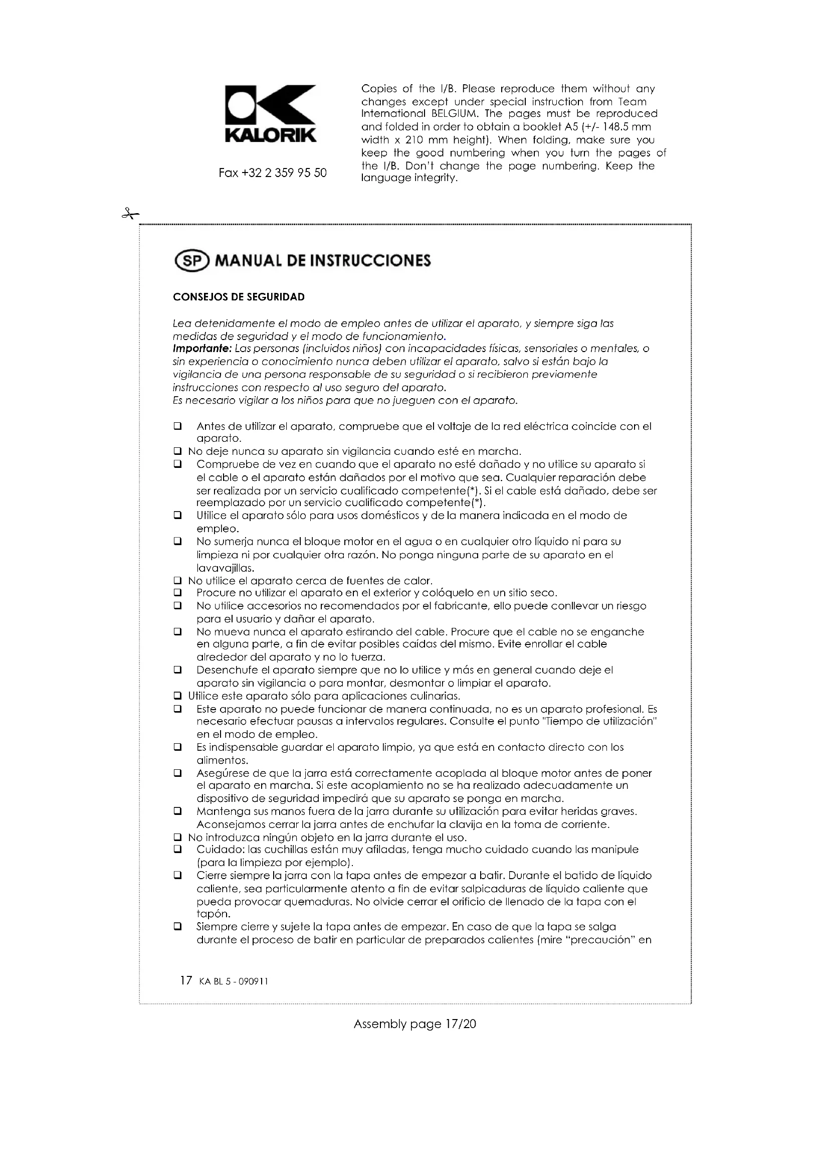 Lea detenidamente el modo de empleo antes de utilizar el aparato, y siempre siga las medidas de seguridad y el modo de funcionamiento. Importante: Las personas (incluidos niños) con incapacidades físicas, sensoriales o mentales, o sin experiencia o conocimiento nunca deben utilizar el aparato, salvo si están bajo la vigilancia de una persona responsable de su seguridad o si recibieron previamente instrucciones con respecto al uso seguro del aparato. Es necesario vigilar a los niños para que no jueguen con el aparato. Antes de utilizar el aparato, compruebe que el voltaje de la red eléctrica coincide con el aparato. No deje nunca su aparato sin vigilancia cuando esté en marcha. Compruebe de vez en cuando que el aparato no esté dañado y no utilice su aparato si el cable o el aparato están dañados por el motivo que sea. Cualquier reparación debe ser realizada por un servicio cualificado competente(*). Si el cable está dañado, debe ser reemplazado por un servicio cualificado competente(*). Utilice el aparato sólo para usos domésticos y de la manera indicada en el modo de empleo. No sumerja nunca el bloque motor en el agua o en cualquier otro líquido ni para su limpieza ni por cualquier otra razón. No ponga ninguna parte de su aparato en el lavavajillas. No utilice el aparato cerca de fuentes de calor. Procure no utilizar el aparato en el exterior y colóquelo en un sitio seco. No utilice accesorios no recomendados por el fabricante, ello puede conllevar un riesgo para el usuario y dañar el aparato. No mueva nunca el aparato estirando del cable. Procure que el cable no se enganche en alguna parte, a fin de evitar posibles caídas del mismo. Evite enrollar el cable alrededor del aparato y no lo tuerza. Desenchufe el aparato siempre que no lo utilice y más en general cuando deje el aparato sin vigilancia o para montar, desmontar o limpiar el aparato. Utilice este aparato sólo para aplicaciones culinarias. Este aparato no puede funcionar de manera continuada, no es un aparato profesional. Es necesario efectuar pausas a intervalos regulares. Consulte el punto "Tiempo de utilización" en el modo de empleo. Es indispensable guardar el aparato limpio, ya que está en contacto directo con los alimentos. Asegúrese de que la jarra está correctamente acoplada al bloque motor antes de poner el aparato en marcha. Si este acoplamiento no se ha realizado adecuadamente un dispositivo de seguridad impedirá que su aparato se ponga en marcha. Mantenga sus manos fuera de la jarra durante su utilización para evitar heridas graves. Aconsejamos cerrar la jarra antes de enchufar la clavija en la toma de corriente. No introduzca ningún objeto en la jarra durante el uso. Cuidado: las cuchillas están muy afiladas, tenga mucho cuidado cuando las manipule (para la limpieza por ejemplo). Cierre siempre la jarra con la tapa antes de empezar a batir. Durante el batido de líquido caliente, sea particularmente atento a fin de evitar salpicaduras de líquido caliente que pueda provocar quemaduras. No olvide cerrar el orificio de llenado de la tapa con el tapón. Siempre cierre y sujete la tapa antes de empezar. En caso de que la tapa se salga durante el proceso de batir en particular de preparados calientes (mire “precaución” en Copies of the I/B. Please reproduce them without any changes except under special instruction from Team International BELGIUM. The pages must be reproduced and folded in order to obtain a booklet A5 (+/- 148.5 mm width x 210 mm height). When folding, make sure you keep the good numbering when you turn the pages of the I/B. Don’t change the page numbering. Keep the language integrity. 18 KA BL 5 - 090911