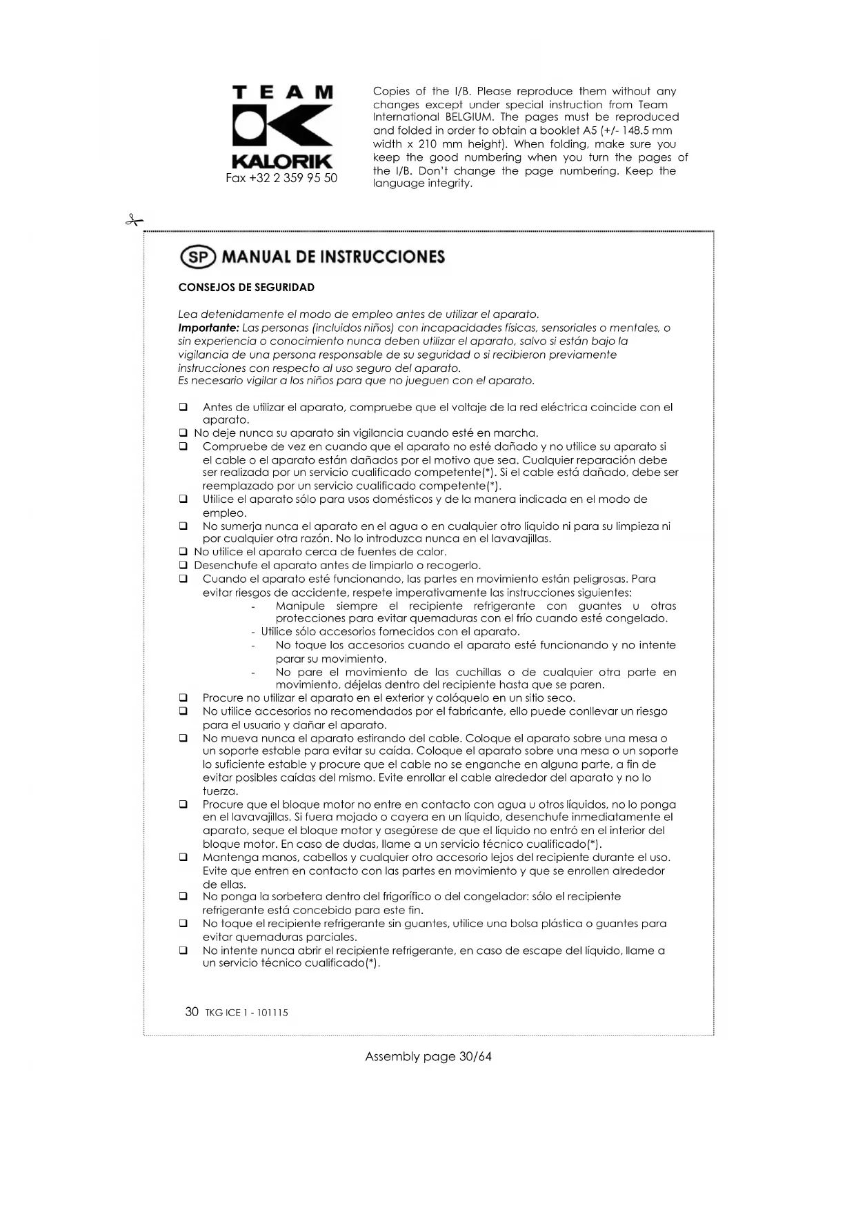 Lea detenidamente el modo de empleo antes de utilizar el aparato. Importante: Las personas (incluidos niños) con incapacidades físicas, sensoriales o mentales, o sin experiencia o conocimiento nunca deben utilizar el aparato, salvo si están bajo la vigilancia de una persona responsable de su seguridad o si recibieron previamente instrucciones con respecto al uso seguro del aparato. Es necesario vigilar a los niños para que no jueguen con el aparato. Antes de utilizar el aparato, compruebe que el voltaje de la red eléctrica coincide con el aparato. No deje nunca su aparato sin vigilancia cuando esté en marcha. Compruebe de vez en cuando que el aparato no esté dañado y no utilice su aparato si el cable o el aparato están dañados por el motivo que sea. Cualquier reparación debe ser realizada por un servicio cualificado competente(*). Si el cable está dañado, debe ser reemplazado por un servicio cualificado competente(*). Utilice el aparato sólo para usos domésticos y de la manera indicada en el modo de empleo. No sumerja nunca el aparato en el agua o en cualquier otro líquido ni para su limpieza ni por cualquier otra razón. No lo introduzca nunca en el lavavajillas. No utilice el aparato cerca de fuentes de calor. Desenchufe el aparato antes de limpiarlo o recogerlo. Cuando el aparato esté funcionando, las partes en movimiento están peligrosas. Para evitar riesgos de accidente, respete imperativamente las instrucciones siguientes: - Manipule siempre el recipiente refrigerante con guantes u otras protecciones para evitar quemaduras con el frío cuando esté congelado. - Utilice sólo accesorios fornecidos con el aparato. - No toque los accesorios cuando el aparato esté funcionando y no intente parar su movimiento. - No pare el movimiento de las cuchillas o de cualquier otra parte en movimiento, déjelas dentro del recipiente hasta que se paren. Procure no utilizar el aparato en el exterior y colóquelo en un sitio seco. No utilice accesorios no recomendados por el fabricante, ello puede conllevar un riesgo para el usuario y dañar el aparato. No mueva nunca el aparato estirando del cable. Coloque el aparato sobre una mesa o un soporte estable para evitar su caída. Coloque el aparato sobre una mesa o un soporte lo suficiente estable y procure que el cable no se enganche en alguna parte, a fin de evitar posibles caídas del mismo. Evite enrollar el cable alrededor del aparato y no lo tuerza. Procure que el bloque motor no entre en contacto con agua u otros líquidos, no lo ponga en el lavavajillas. Si fuera mojado o cayera en un líquido, desenchufe inmediatamente el aparato, seque el bloque motor y asegúrese de que el líquido no entró en el interior del bloque motor. En caso de dudas, llame a un servicio técnico cualificado(*). Mantenga manos, cabellos y cualquier otro accesorio lejos del recipiente durante el uso. Evite que entren en contacto con las partes en movimiento y que se enrollen alrededor de ellas. No ponga la sorbetera dentro del frigorífico o del congelador: sólo el recipiente refrigerante está concebido para este fin. No toque el recipiente refrigerante sin guantes, utilice una bolsa plástica o guantes para evitar quemaduras parciales. No intente nunca abrir el recipiente refrigerante, en caso de escape del líquido, llame a un servicio técnico cualificado(*). Copies of the I/B. Please reproduce them without any changes except under special instruction from Team International BELGIUM. The pages must be reproduced and folded in order to obtain a booklet A5 (+/- 148.5 mm width x 210 mm height). When folding, make sure you keep the good numbering when you turn the pages of the I/B. Don’t change the page numbering. Keep the language integrity.
