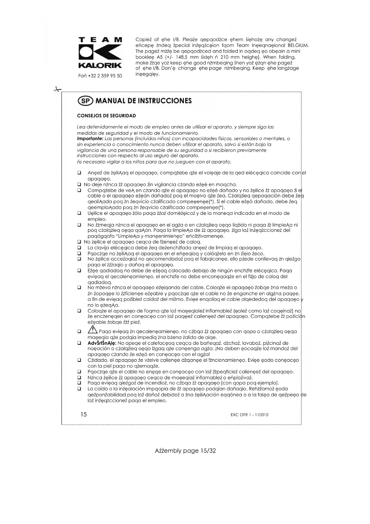- Para limpiar el aparato utilice un paño humedecido; no sumerja nunca el aparato en agua o en cualquier otro líquido. PROTECCIÓN DEL MEDIO AMBIENTE – DIRECTIVA 2002/96/CE Para poder preservar nuestro medio ambiente y proteger la salud humana, los residuos eléctricos y equipos electrónicos deberían ser destruidos de acuerdo con unas normas especificas con la implicación de ambos proveedores y consumidores. Por esta razón, como indica el símbolo en la placa de datos técnicos, su aparato no debería ser tirado en un contenedor municipal sino que debería ser devuelto a la tienda, o dejado en un punto de recolección para ser reciclado o usado para otras aplicaciones conforme a la directiva.Copies of the I/B. Please reproduce them without any changes except under special instruction from Team International BELGIUM. The pages must be reproduced and folded in order to obtain a mini booklet A5 (+/- 148.5 mm width x 210 mm height). When folding, make sure you keep the good numbering when you turn the pages of the I/B. Don’t change the page numbering. Keep the language integrity.