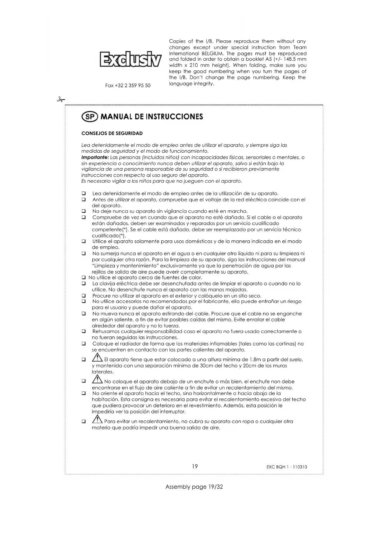Assembly page 19/32 Copies of the I/B. Please reproduce them without any changes except under special instruction from Team International BELGIUM. The pages must be reproduced and folded in order to obtain a booklet A5 (+/- 148.5 mm width x 210 mm height). When folding, make sure you keep the good numbering when you turn the pages of the I/B. Don’t change the page numbering. Keep the language integrity. Fax +32 2 359 95 50 Atención: No usar cerca del baño, piscina u otro recipiente que contenga líquidos para evitar cortacircuitos. Mas en general no toque los mandos de su aparato si sus manos están húmedas o si se encuentra en contacto con agua. No utilice el aparato en habitaciones con productos inflamables o explosivos. No deje que ningún objeto penetre por la rejilla o dentro del aparato. No utilice este aparato con un dispositivo de comado térmico, programador, un interruptor cronométrico o cualquier otro dispositivo que ponga el aparato en marcha automáticamente ya que correrá el riesgo de que su radiador se apague o encienda cuando no deba o se desplace. No utilice el aparato en lugares donde el ambiente contiene demasiado cloro, dioxído de sulfato o gas inflamables. Podría modificar el color de los elementos calentadores. De consecuencia, podrían ser danificados y desformarse durante el funcionamiento. (*) Servicio técnico cualificado: servicio técnico del fabricante o importador o de una persona cualificada, reconocida y habilitada a fin de evitar cualquier peligro. En cualquier caso devuelva el aparato al servicio técnico.