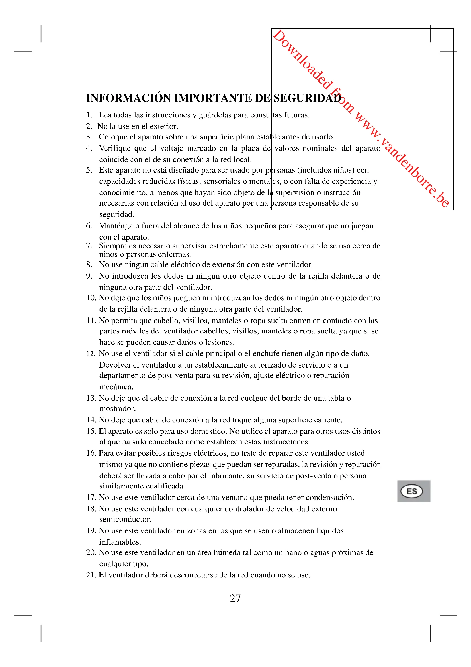 22. Nunca desenchufe el ventilador tirando del cable principal, desconéctelo siempre