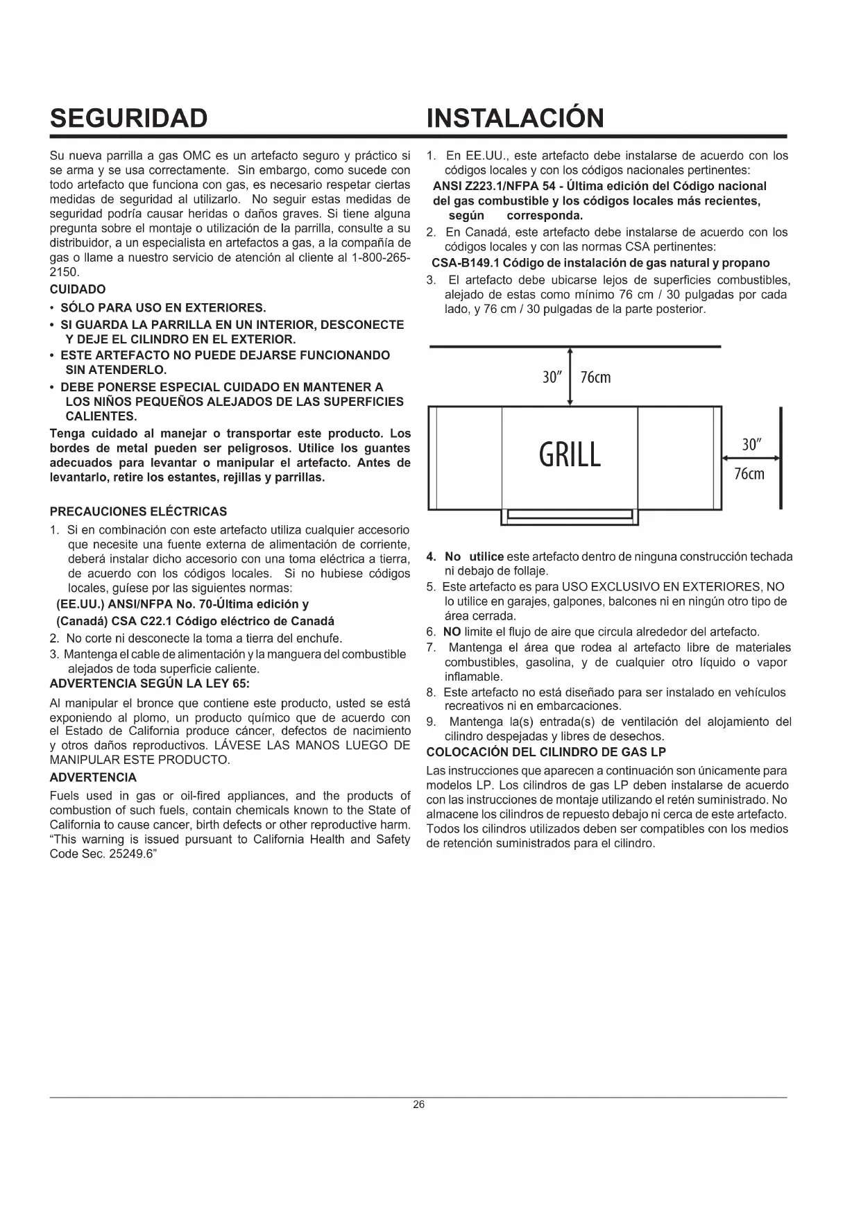 - El artefacto debe ubicarse lejos de superficies combustibles, alejado de estas como minimo 76~cm / 30 pulgadas por cada lado, y 76~cm / 30 pulgadas de la parte posterior.