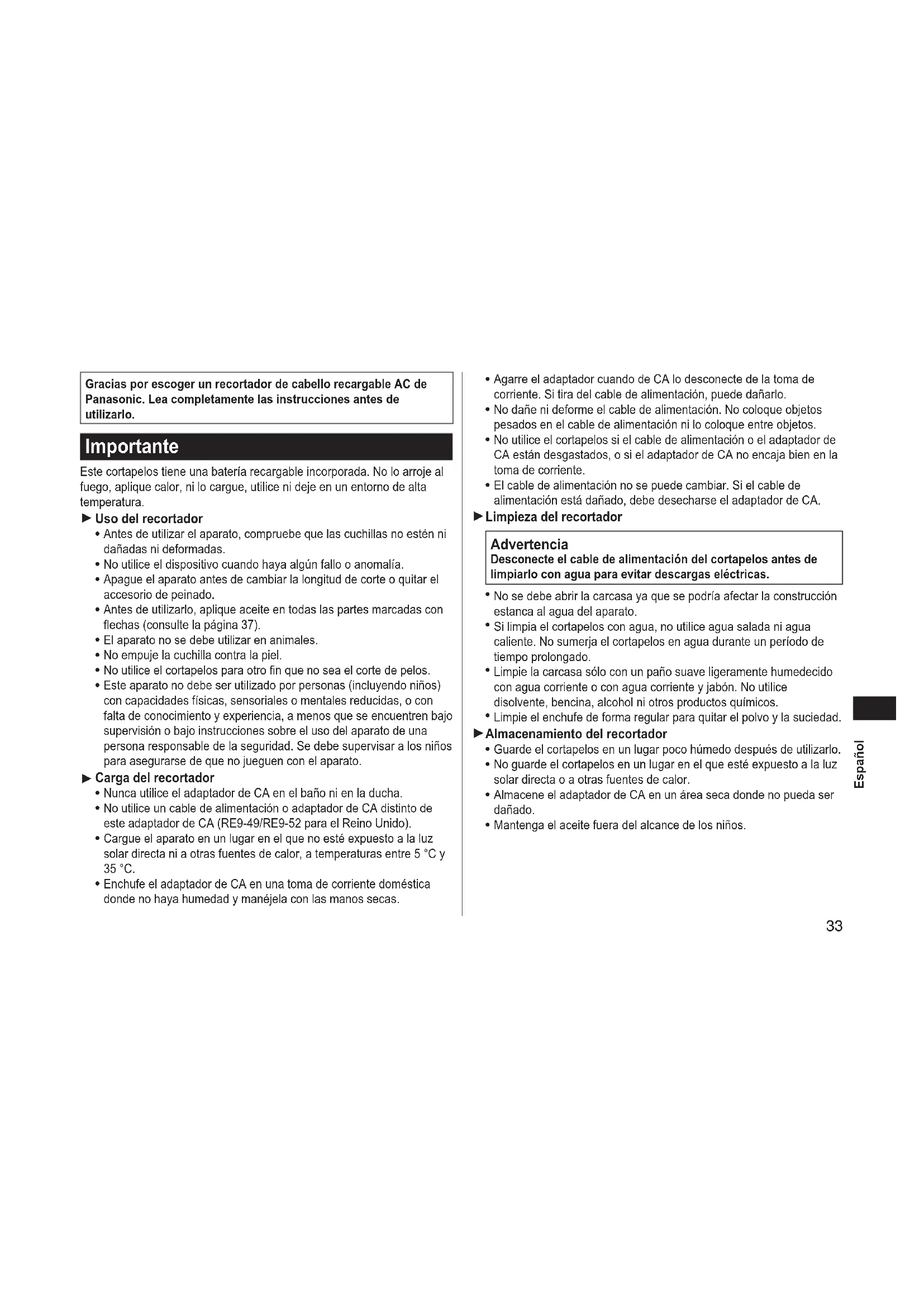 Gracias por escoger un recortador de cabello recargable AC de Panasonic. Lea completamente las instrucciones antes de utilizarlo. Importante Este cortapelos tiene una batería recargable incorporada. No lo arroje al fuego, aplique calor, ni lo cargue, utilice ni deje en un entorno de alta temperatura. Uso del recortador Antes de utilizar el aparato, compruebe que las cuchillas no estén ni dañadas ni deformadas. No utilice el dispositivo cuando haya algún fallo o anomalía. Apague el aparato antes de cambiar la longitud de corte o quitar el accesorio de peinado. Antes de utilizarlo, aplique aceite en todas las partes marcadas con echas (consulte la página 37). El aparato no se debe utilizar en animales. No empuje la cuchilla contra la piel. No utilice el cortapelos para otro n que no sea el corte de pelos. Este aparato no debe ser utilizado por personas (incluyendo niños) con capacidades físicas, sensoriales o mentales reducidas, o con falta de conocimiento y experiencia, a menos que se encuentren bajo supervisión o bajo instrucciones sobre el uso del aparato de una persona responsable de la seguridad. Se debe supervisar a los niños para asegurarse de que no jueguen con el aparato. Carga del recortador Nunca utilice el adaptador de CA en el baño ni en la ducha. No utilice un cable de alimentación o adaptador de CA distinto de este adaptador de CA (RE9‑49/RE9‑52 para el Reino Unido). Cargue el aparato en un lugar en el que no esté expuesto a la luz solar directa ni a otras fuentes de calor, a temperaturas entre 5 °C y 35 °C. Enchufe el adaptador de CA en una toma de corriente doméstica donde no haya humedad y manéjela con las manos secas.