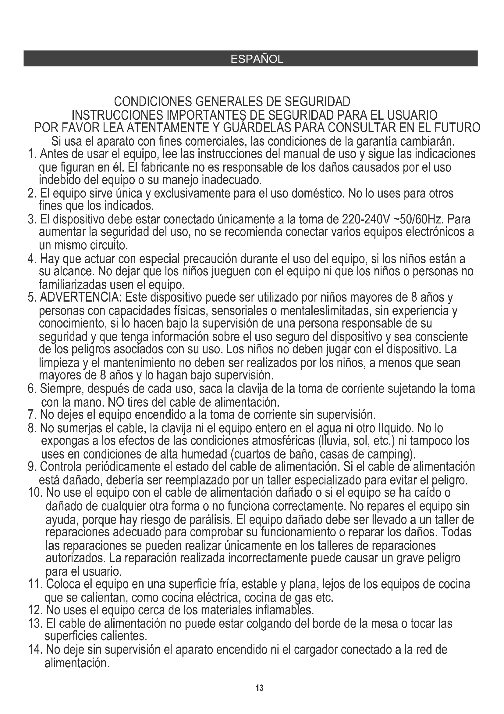 INSTRUCCIONES IMPORTANTES DE SEGURIDAD PARA EL USUARIO POR FAVOR LEA ATENTAMENTE Y GUÁRDELAS PARA CONSULTAR EN EL FUTURO Si usa el aparato con fines comerciales, las condiciones de la garantía cambiarán.