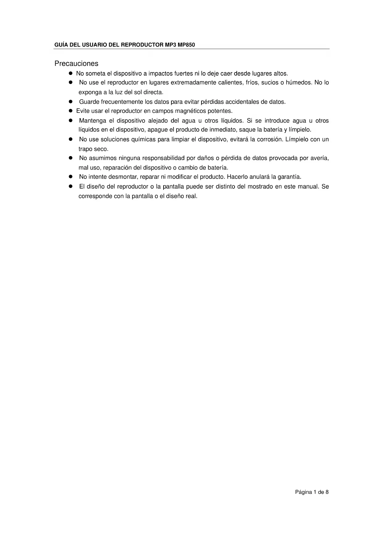 base del PC. El tiempo mostrado cambia constantemente. La tasa de bits del archivo MP3 cambia durante la reproducción. Pruebe a usar una tasa de bits fija para comprimir el archivo MP3. El PC devuelve un error cuando se conecta y desconecta el reproductor. El reproductor se desconecta bruscamente del PC mientras se transfieren archivos. No desconecte el reproductor del PC cuando transfiera archivos.GUÍA DEL USUARIO DEL REPRODUCTOR MP3 MP850 Página 7 de 8 La memoria total indicada en el reproductor no coincide con la cantidad especificada. Parte de la memoria se usa para guardar programas y mostrar caracteres. Algunos archivos MP3 no pueden reproducirse correctamente. El archivo MP3 está comprimido en un estándar, como MPEG I Layer 1 o Layer 2, que el reproductor no soporta.