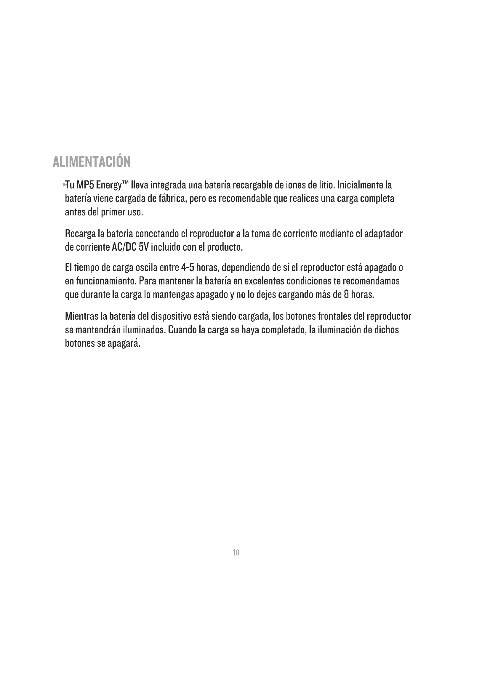 Tu MP5 Energy™ lleva integrada una batería recargable de iones de litio. Inicialmente la batería viene cargada de fábrica, pero es recomendable que realices una carga completa antes del primer uso. Recarga la batería conectando el reproductor a la toma de corriente mediante el adaptador de corriente AC/DC 5V incluido con el producto. El tiempo de carga oscila entre 4-5 horas, dependiendo de si el reproductor está apagado o en funcionamiento. Para mantener la batería en excelentes condiciones te recomendamos que durante la carga lo mantengas apagado y no lo dejes cargando más de 8 horas. Mientras la batería del dispositivo está siendo cargada, los botones frontales del reproductor se mantendrán iluminados. Cuando la carga se haya completado, la iluminación de dichos botones se apagará.11 ESPAÑOL