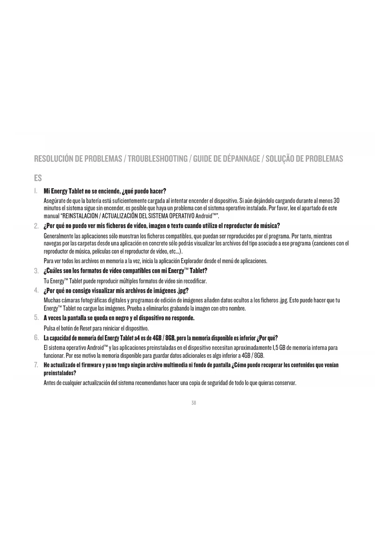 Mi Energy Tablet no se enciende, ¿qué puedo hacer? Asegúrate de que la batería está suficientemente cargada al intentar encender el dispositivo. Si aún dejándolo cargando durante al menos 30 minutos el sistema sigue sin encender, es posible que haya un problema con el sistema operativo instalado. Por favor, lee el apartado de este manual “REINSTALACION / ACTUALIZACIÓN DEL SISTEMA OPERATIVO Android™”.