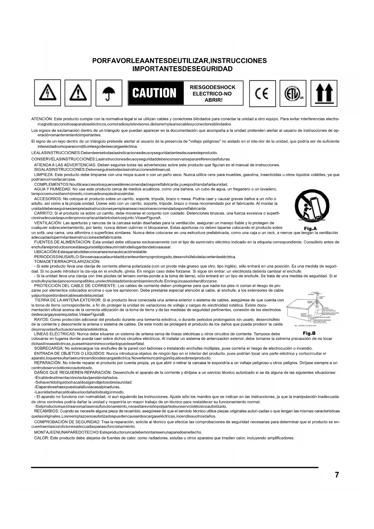 CDX-2250 SPECIFICATIONS:ATENCIÓN: Este producto cumple con la normativa legal si se utilizan cables y conectores blindados para conectar la unidad a otro equipo. Para evitar interferencias electro- magnéticas con otros aparatos eléctricos, como radios y televisores, deben emplearse cables y conectores blindados. Los signos de exclamación dentro de un triángulo que puedan aparecer en la documentación que acompaña a la unidad pretenden alertar al usuario de instrucciones de op- eración o mantenimiento importantes. El signo de un rayo dentro de un triángulo pretende alertar al usuario de la presencia de "voltaje peligroso" no aislado en el inte-rior de la unidad, que podría ser de suficiente intensidad como para constituir riesgo de descarga eléctrica.LEA LAS INSTRUCCIONES: Deben leerse todas las indicaciones de uso y seguridad antes de usar este producto.CONSERVE LAS INSTRUCCIONES: Las instrucciones de uso y seguridad deben conservarse para referencias futuras. ATIENDA A LAS ADVERTENCIAS: Deben seguirse todas las advertencias sobre este producto que figuran en el manual de instrucciones. SIGA LAS INSTRUCCIONES: Deben seguirse todas las instrucciones del manual. LIMPIEZA: Este producto debe limpiarse con una mopa suave o con un paño seco. Nunca utilice cera para muebles, gasolina, insecticidas u otros líquidos volátiles, ya que podrían corroer la carcasa.COMPLEMENTOS: No utilice accesorios que no estén recomendados por el fabricante, pues podrían dañar la unidad. AGUA Y HUMEDAD: No use este producto cerca de medios acuáticos, como una bañera, un cubo de agua, un fregadero o un lavadero; tampoco en un sótano húmedo, ni cerca de una piscina o similar. ACCESORIOS: No coloque el producto sobre un carrito, soporte, trípode, brazo o mesa. Podría caer y causar graves daños a un niño o adulto, así como a la propia unidad. Úsese sólo con un carrito, soporte, trípode, brazo o mesa recomendado por el fabricante. Al montar la unidad deben seguirse siempre las instrucciones y emplearse accesorios recomendados por el fabricante. CARRITO: Si el producto va sobre un carrito, debe moverse el conjunto con cuidado. Detenciones bruscas, una fuerza excesiva o superfi- cies inadecuadas pueden provocar la caída de todo el conjunto. Véase Figura A. VENTILACIÓN: Las aperturas y ranuras de la carcasa están diseñadas para la ventilación, aseguran un manejo fiable y lo protegen de cualquier sobrecalentamiento, por tanto, nunca deben cubrirse ni bloquearse. Estas aperturas no deben taparse colocando el producto sobre un sofá, una cama, una alfombra o superficies similares. Nunca debe colocarse en una estructura prefabricada, como una caja o un rack, a menos que tengan la ventilación adecuada o lo permitan las instrucciones del fabricante. FUENTES DE ALIMENTACIÓN: Esta unidad debe utilizarse exclusivamente con el tipo de suministro eléctrico indicado en la etiqueta correspondiente. Consúltelo antes de enchufar el producto si no está seguro del tipo de suministro del lugar donde lo va a usar.UBICACIÓN: Este aparato debe colocarse en una ubicación estable.PERIODOS SIN USARLO: Si no se va a usar la unidad durante un tiempo prolongado, desenchúfelo de la corriente eléctrica.TOMA DE TIERRA O POLARIZACIÓN: - Si este producto lleva una clavija de corriente alterna polarizada (con un pivote más grueso que otro, tipo inglés), sólo entrará en una posición. Es una medida de seguri- dad. Si no puede introducir la cla-vija en el enchufe, gírela. En ningún caso debe forzarse. Si sigue sin entrar, un electricista debería cambiar el enchufe. - Si la unidad lleva una clavija con tres pivotes (el tercero corres-ponde a la toma de tierra), sólo entrará en un tipo de enchufe. Se trata de una medida de seguridad. Si el enchufe y la clavija no son compatibles, un electricista deberá cambiar el enchufe. En ningún caso deberá forzarse. PROTECCIÓN DEL CABLE DE CORRIENTE: Los cables de corriente deben protegerse para que nadie los pise ni corran el riesgo de pin- zarse por elementos colocados encima o que los aprisionen. Debe prestarse especial atención al cable, al enchufe, a los extensores de cable y al punto por donde el cable sale de la unidad. TIERRA DE LA ANTENA EXTERIOR: Si el producto lleva conectada una antena exterior o sistema de cables, asegúrese de que cuenta con la toma de tierra correspondiente, a fin de proteger la unidad de variaciones de voltaje y cargas de electricidad estática. Existe docu- mentación oficial acerca de la correcta utilización de la toma de tierra y de las medidas de seguridad pertinentes, conexión de los electrodos de descarga y sus requisitos. Véase Figura B. RAYOS: Como protección adicional del producto durante una tormenta eléctrica, o durante periodos prolongados sin usarlo, desenchúfelo de la corriente y desconecte la antena o sistema de cables. De este modo se protegerá el producto de los daños que pueda producir la caída de un rayo o las fluctuaciones de la red eléctrica. LÍNEAS ELÉCTRICAS: Nunca debe situarse un sistema de antena cerca de líneas eléctricas u otros circuitos de corriente. Tampoco debe colocarse en lugares donde pueda caer sobre dichos circuitos eléctricos. Al instalar un sistema de antenización exterior, debe tomarse la extrema precaución de no tocar dichas líneas eléctricas, pues el mas minimo contacto puede ser fatal. SOBRECARGA: No sobrecargue los enchufes de la pared con ladrones o instalando enchufes múltiples, pues correría el riesgo de electrocución o incendio. ENTRADA DE OBJETOS O LÍQUIDOS: Nunca introduzca objetos de ningún tipo en el interior del producto, pues podrían tocar una parte eléctrica y cortocircuitar el aparato, lo que resultaría en un incendio o descarga eléctrica. No verter nunca ningún líquido sobre el producto. REPARACIÓN: No intente reparar el producto por cuenta propia, ya que abrir o retirar la carcasa le expondría a un voltaje peligroso u otros peligros. Diríjas