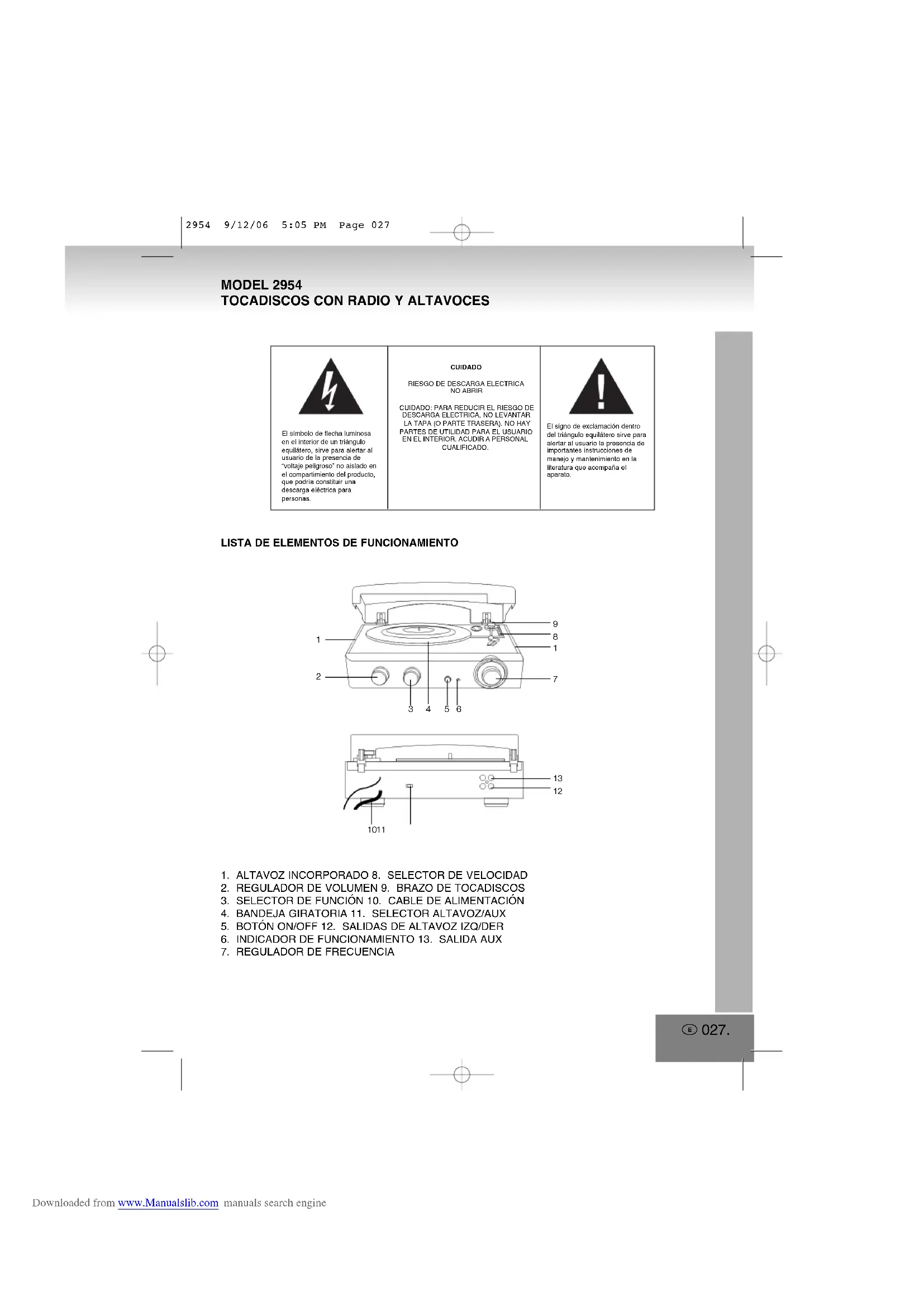 Cuidar que ellos no se traguen pequeñas piezas del aparato y las baterías. Si esto ocurre es muy peligroso para su salud y puede provocar asfixia. Preste mucha atención de mantener los pequeños aparatos y baterías fuera del alcance de los niños. Importante aviso respecto a la protección de sus oídos Cuidado: Cuide usted de su capacidad auditiva, como lo hacemos nosotros. Por lo tanto, tenga precaución cuando use el aparato. Nuestra recomendación: Evite el volumen alto. En caso que el aparato sea usado por los niños, asegúrese que la aplicación no este en alto volumen. Peligro! El alto volumen puede causar irreparables danos a los oídos de los niños. NUNCA permita que alguna persona o en especial niños pongan objetos dentro de los huecos, ranuras u otras aberturas del aparato. Esto puede provocar peligro de muerte por un choque eléctrico. El aparato solo debe ser abierto por un asistente calificado. Solamente use el aparato para los propósitos que fue diseñado. Le recomendamos que conserve las instrucciones de manejo para un eventual uso posterior. Reciclaje profesional Baterías y empajes no deben estar in el basurero de su casa. Las baterías deben ser recogidas por el personal del centro recolector de baterías usadas. Disponga por separado de los materiales de empaque es una ayuda para la ecología. E 030. 2954 9/12/06 5:05 PM Page 030 Downloaded from www.Manualslib.com manuals search engineNo impida la ventilación del aparato. Asegúrese, que cortinas, periódicos, coberturas o muebles no estén bloqueando las ranuras de ventilación del aparato. La ventilación debe asegurarse todo el tiempo! El sobrecalentamiento puede causar serios daños en el interior del aparato y reduce su buen funcionamiento y su tiempo de vida. Caliente y Caluroso No exponga el aparato a la luz directa del sol. Asegúrese que el aparato no esta expuesto directamente a fuerzas calientes semejantes a calefactores o fuego directo. Asegúrese que la ventilación de las ranuras del aparato no esté cubierta. Humedad y limpieza Este aparato no es impermeable! No sumerja el aparato en el agua. No permite que el aparato entre en contacto con el agua. La entrada de agua en el aparato causa serios problemas y daños. No use agentes limpiadores que contengan alcohol, amoniacos, benzinas o abrasivos estos pueden dañar al aparato. Para la limpieza use un suave y húmedo paño. Indicaciones sobre el medio ambiente No deseche este producto en la basura doméstica una vez que se haya cumplido su vida de funcionamiento, deposítelo en un punto de recogida de aparatos eléctricos y electrónicos. El símbolo que se encuentra en el producto, el manual de usuario o el embalaje, hacen referencia a este punto. El plástico es reutilizable según esté indicado. Con la reutilización de productos de plástico reciclado u otra clase de reciclaje de aparatos viejos, está contribuyendo de forma importante a la conservación del medio ambiente. Infórmese en su administración local sobre la entidad de eliminación de residuos competente. E 031. 2954 9/12/06 5:05 PM Page 031 Downloaded from www.Manualslib.com manuals search engineLISTA DE COMPONENTES1. ALTO-FALANTES EMBUTIDOS 8. BOTÃO DE SELECÇÃO DE VELOCIDADE2. REGULADOR DE VOLUME 9. LEITOR3. BOTÃO DE SELECÇÃO DE FUNÇÃO 10. CABO ELÉCTRICO4. PLACA GIRATÓRIA 11. BOTÃO ALTO-FALANTE/AUX5. BOTÃO LIGA/DESLIGA 12. ENTRADA L/R PARA ALTO-FALANTES6. VISOR 13. SAÍDA AUX7. REGULADOR DE FREQUÊNCIA P 032. MODEL 2954