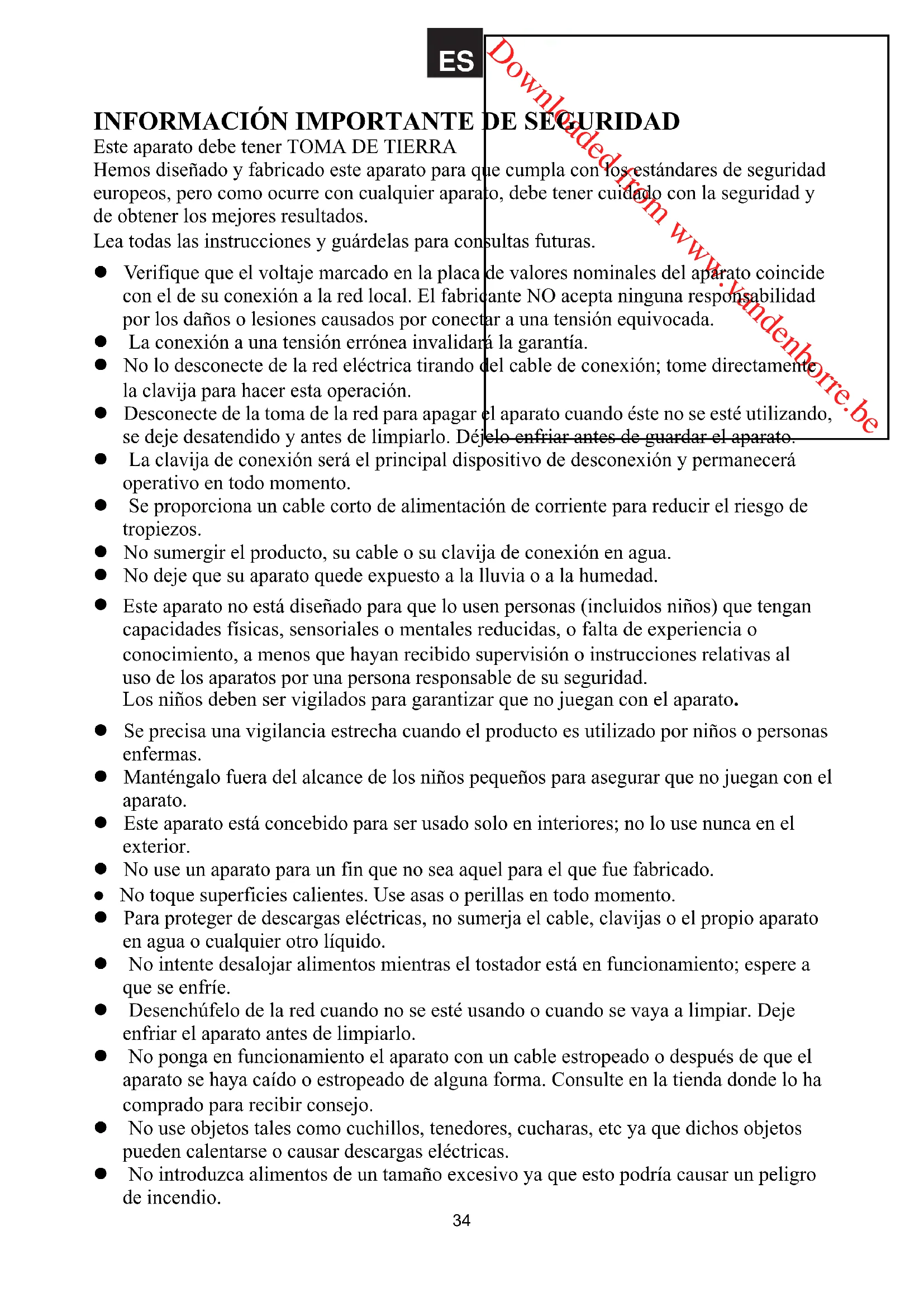 Este aparato no está diseñado para que lo usen personas (incluidos niños) que tengan capacidades físicas, sensoriales o mentales reducidas, o falta de experiencia o conocimiento, a menos que hayan recibido supervisión o instrucciones relativas al uso de los aparatos por una persona responsable de su seguridad. Los niños deben ser vigilados para garantizar que no juegan con el aparato.Downloaded from www.vandenborre.be z No deje que el cable cuelgue sobre el borde de la superficie ni que entre en contacto con superficies calientes. z No coloque el aparato encima o cerca de un quemador eléctrico o de gas que esté caliente o sobre un horno calentado. z No utilice el aparato cerca de algún recipiente que contenga líquido como por ejemplo un fregadero. z Para desconectar de la red, quite la clavija de la toma de red. z No use accesorios que no estén recomendados por el fabricante para evitar el riesgo de incendios, descargas eléctricas o lesiones personales. z No coloque artículos envueltos en papel de aluminio dentro del horno. z Retire todos los envoltorios antes de colocar pan en el horno. z Este aparato NO está diseñado para funcionar mediante un cronómetro externo o un sistema de control remoto separado. ATENCIÓN: Superficies calientes. Las temperaturas de las superficies que están accesibles son propensas a calentarse cuando el aparato está en funcionamiento. ATENCIÓN: z Este aparato está diseñado sólo para uso doméstico. El uso comercial o de cualquier otro tipo puede invalidar la garantía y resultar peligroso. z Si se estropea el cable de red, debe ser reemplazado por el fabricante, su agente de servicio o por una persona de cualificación similar con el fin de evitar peligros. z No use este aparato en las proximidades de un baño o desagüe o cualquier recipiente que contenga agua o líquidos. Si se deja caer el aparato en agua no intente alcanzarlo, apague el interruptor y desconecte de la red y escurra el agua antes de recuperar el aparato, no use de nuevo el aparato hasta que haya sido verificado por un agente de servicio cualificado.