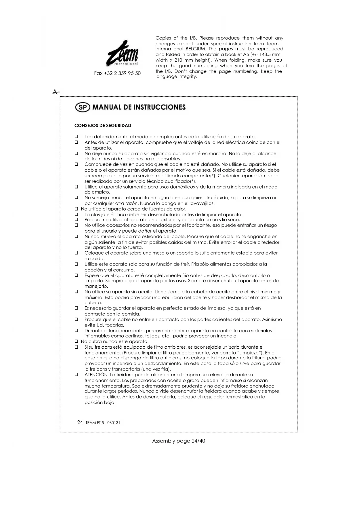 Lea detenidamente el modo de empleo antes de la utilización de su aparato. Antes de utilizar el aparato, compruebe que el voltaje de la red eléctrica coincide con el del aparato. No deje nunca su aparato sin vigilancia cuando esté en marcha. No lo deje al alcance de los niños ni de personas no responsables. Compruebe de vez en cuando que el cable no esté dañado. No utilice su aparato si el cable o el aparato están dañados por el motivo que sea. Si el cable está dañado, debe ser reemplazado por un servicio cualificado competente(*). Cualquier reparación debe ser realizada por un servicio técnico cualificado(*). Utilice el aparato solamente para usos domésticos y de la manera indicada en el modo de empleo. No sumerja nunca el aparato en agua o en cualquier otro líquido, ni para su limpieza ni por cualquier otra razón. Nunca lo ponga en el lavavajillas. No utilice el aparato cerca de fuentes de calor. La clavija eléctrica debe ser desenchufada antes de limpiar el aparato. Procure no utilizar el aparato en el exterior y colóquelo en un sitio seco. No utilice accesorios no recomendados por el fabricante, eso puede entrañar un riesgo para el usuario y puede dañar el aparato. Nunca mueva el aparato estirando del cable. Procure que el cable no se enganche en algún saliente, a fin de evitar posibles caídas del mismo. Evite enrollar el cable alrededor del aparato y no lo tuerza. Coloque el aparato sobre una mesa o un soporte lo suficientemente estable para evitar su caída. Utilice este aparato sólo para su función de freír. Fría sólo alimentos apropiados a la cocción y al consumo. Espere que el aparato esté completamente frío antes de desplazarlo, desmontarlo o limpiarlo. Siempre coja el aparato por las asas. Siempre desenchufe el aparato antes de manejarlo. No utilice su aparato sin aceite. Llene siempre la cubeta de aceite entre el nivel mínimo y máximo. Esto podría provocar una ebullición del aceite y hacer desbordar el mismo de la cubeta. Es necesario guardar el aparato en perfecto estado de limpieza, ya que está en contacto con la comida. Procure que el cable no entre en contacto con las partes calientes del aparato. Asimismo evite Ud. tocarlas. Durante el funcionamiento, procure no poner el aparato en contacto con materiales inflamables como cortinas, tejidos, etc., podría provocar un incendio. No cubra nunca este aparato. Si su freidora está equipada de filtro antiolores, es aconsejable utilizarlo durante el funcionamiento. (Procure limpiar el filtro periodicamente, ver párrafo “Limpieza”). En el caso en que no disponga de filtro antiolores, no coloque la tapa durante la fritura, podría provocar un incendio o un desbordamiento. En este caso la tapa sólo sirve para guardar la freidora y transportarla (una vez fría). ATENCIÓN: La freidora puede alcanzar una temperatura elevada durante su funcionamiento. Los preparados con aceite o grasa pueden inflamarse si alcanzan mucha temperatura. Sea extremadamente prudente y no deje su freidora enchufada durante largos periodos. Nunca olvide desenchufar la freidora cuando acabe y siempre que no la utilice. Antes de desenchufarla, coloque el regulador termostático en la posición baja. Copies of the I/B. Please reproduce them without any changes except under special instruction from Team International BELGIUM. The pages must be reproduced and folded in order to obtain a booklet A5 (+/- 148.5 mm width x 210 mm height). When folding, make sure you keep the good numbering when you turn the pages of the I/B. Don‟t change the page numbering. Keep the language integrity.