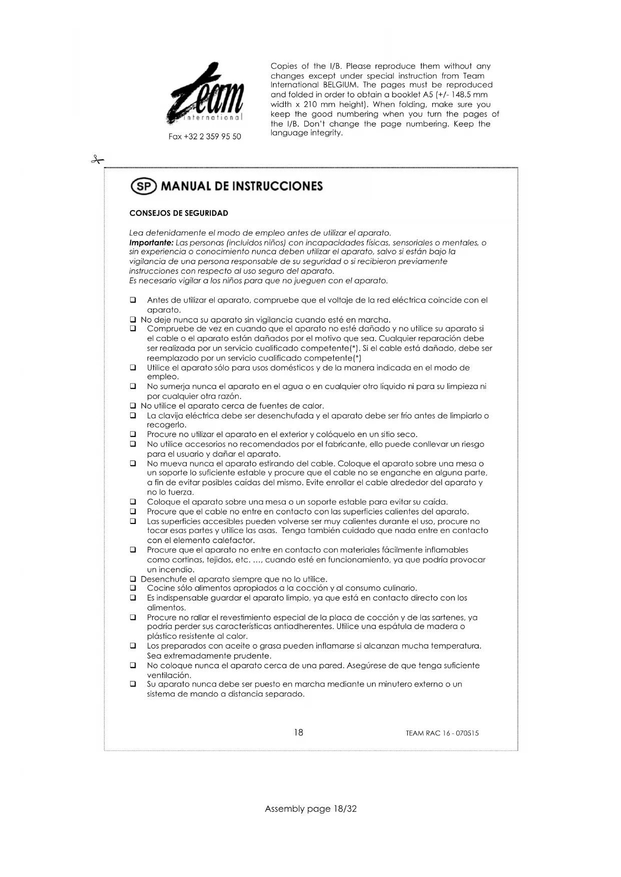 Fax +32 2 359 95 50 PROTECCIÓN DEL MEDIO AMBIENTE –DIRECTIVA 2002/96/CE Para poder preservar nuestro medio ambiente y proteger la salud humana, los residuos eléctricos y equipos electrónicos deberían ser destruidos de acuerdo con unas normas especificas con la implicación de ambos proveedores y consumidores. Por esta razón, como indica el símbolo en la placa de datos técnicos, su aparato no debería ser tirado en un contenedor municipal sino que debería ser devuelto a la tienda, o dejado en un punto de recolección para ser reciclado o usado para otras aplicaciones conforme a la directiva. Copies of the I/B. Please reproduce them without any changes except under special instruction from Team International BELGIUM. The pages must be reproduced and folded in order to obtain a booklet A5 (+/- 148.5 mm width x 210 mm height). When folding, make sure you keep the good numbering when you turn the pages of the I/B. Don’t change the page numbering. Keep the language integrity.