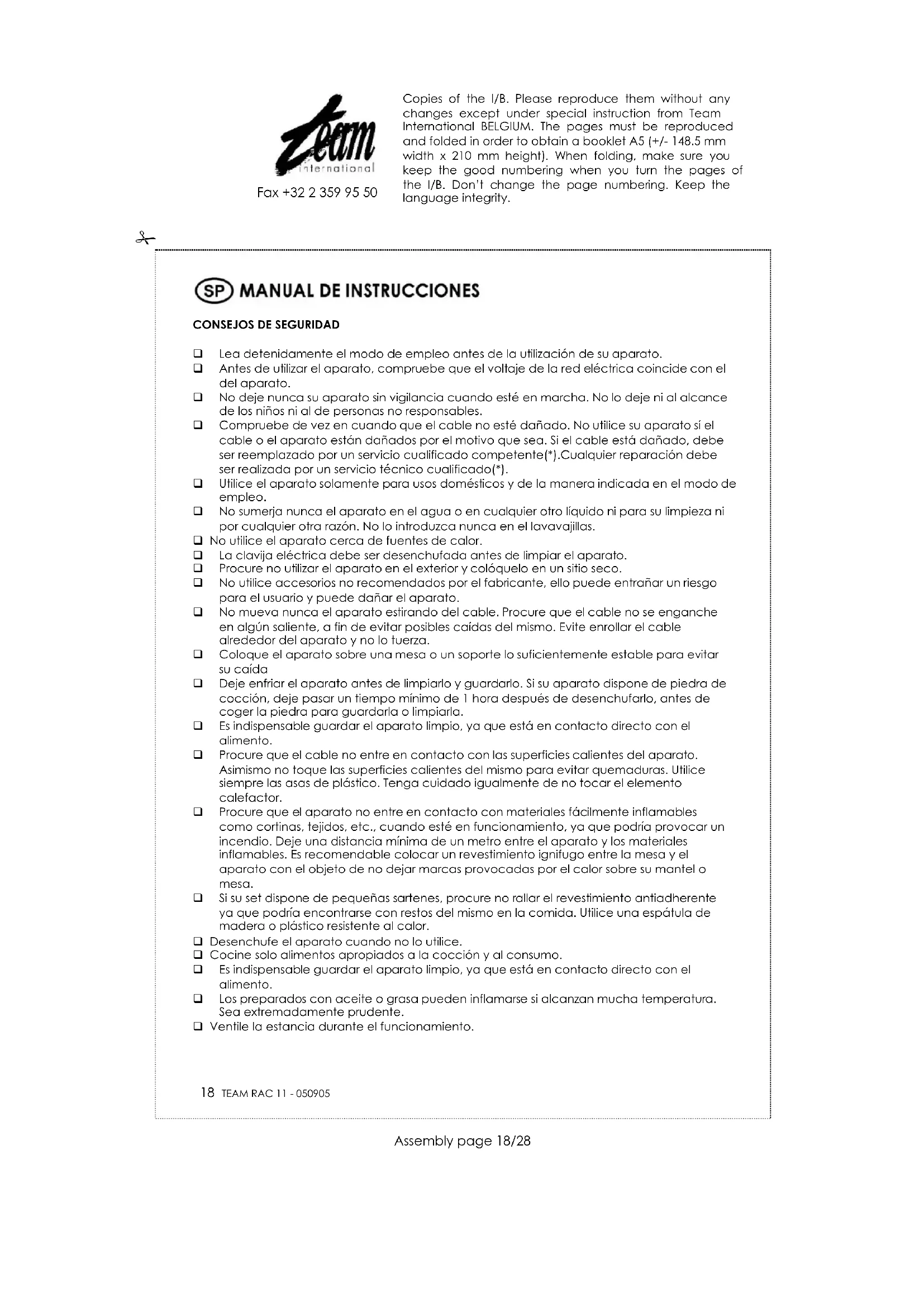 Para poder preservar nuestro medio ambiente y proteger la salud humana, los residuos eléctricos y equipos electrónicos deberían ser destruidos de acuerdo con unas normas especificas con la implicación de ambos proveedores y consumidores. Por esta razón, como indica el símbolo en la placa señalitica, su aparato debería no ser destruido en un contenedor municipal sino que debería ser devuelto a la tienda, o dejarlo en un punto de recolección para que se pueda reciclar que significa que pueda volver a ser usado, reciclando o para otras aplicaciones. Copies of the I/B. Please reproduce them without any changes except under special instruction from Team International BELGIUM. The pages must be reproduced and folded in order to obtain a booklet A5 (+/- 148.5 mm width x 210 mm height). When folding, make sure you keep the good numbering when you turn the pages of the I/B. Don’t change the page numbering. Keep the language integrity.