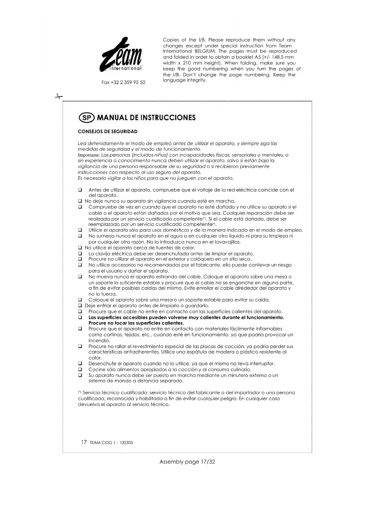 Desenchufe la clavija eléctrica y dejar enfriar el aparato antes de limpiarlo. Limpie las placas de grill con un trapo húmedo, esponja o papel. Para una fácil limpieza usted puede quitar las placas de grill. Para hacer esto, presione el clip de cierre (4) y aléjelo de las placas hasta que sea liberado. No utilice utensilios punzantes. Si las placas de grill están muy sucias, use un producto suave para fregar. Enjuagar con agua caliente y secar las placas cuidadosamente. El proceso de limpieza de hace mejor cuando las placas de grill están todavía un poco calientes. Limpie la parte externa del aparato con un paño suave, si es necesario con un detergente no abrasivo. Asegúrese de que el agua no entre en el aparato. No limpie el aparato con agua corriente. No sumerja nunca el aparato en el agua o en cualquier otro líquido. PROTECCIÓN DEL MEDIO AMBIENTE – DIRECTIVA 2002/96/CE Para poder preservar nuestro medio ambiente y proteger la salud humana, los residuos eléctricos y equipos electrónicos deberían ser destruidos de acuerdo con unas normas especificas con la implicación de ambos proveedores y consumidores. Por esta razón, como indica el símbolo en la placa de datos técnicos, su aparato no debería ser tirado en un contenedor municipal sino que debería ser devuelto a la tienda, o dejado en un punto de recolección para ser reciclado o usado para otras aplicaciones conforme a la directiva. Copies of the I/B. Please reproduce them without any changes except under special instruction from Team International BELGIUM. The pages must be reproduced and folded in order to obtain a booklet A5 (+/- 148.5 mm width x 210 mm height). When folding, make sure you keep the good numbering when you turn the pages of the I/B. Don’t change the page numbering. Keep the language integrity.