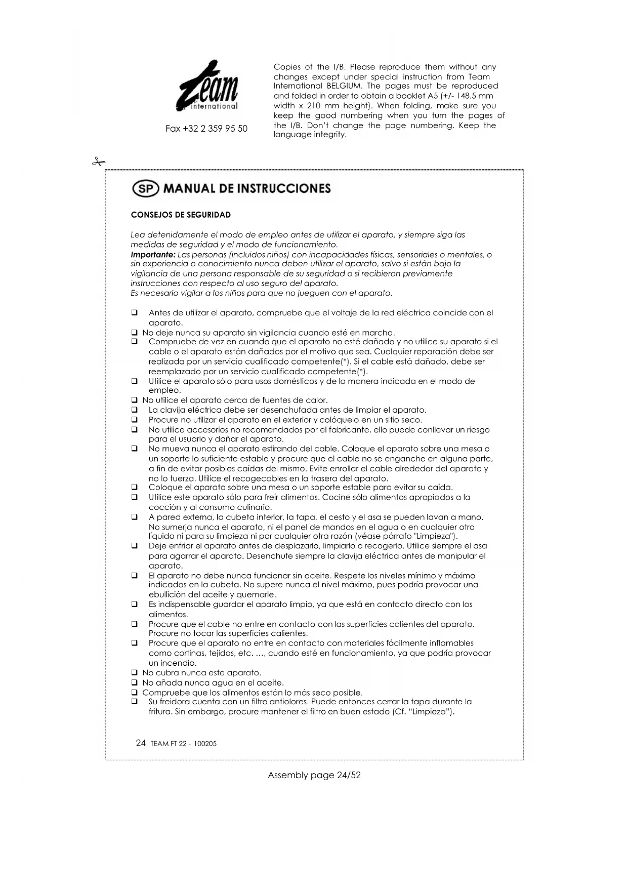Seque los alimentos antes de freírlos. Los alimentos muy húmedos pueden provocar una ebullición del aceite y hacerlo desbordar de la cubeta. Procure que todos los alimentos tengan aproximadamente el mismo tamaño para permitir una fritura uniforme. Ciertos alimentos tienen que ser empanados o rebozados. Espere siempre que la freidora alcance la temperatura deseada y el testigo luminoso de temperatura se apague antes de añadir los alimentos. No llene en exceso la cesta. ATENCIÓN: Si, por accidente, se pone la freidora en marcha sin aceite o grasa o sin la cantidad mínima obligatoria, la freidora se parará automáticamente, a fin de impedir que se sobrecaliente el aparato. Si ocurriera, apague primero el aparato y desenchúfelo. Espere que se enfríe (unos 15 minutos). Pulse el botón restart introduciendo un objeto puntiagudo en el fondo del orificio indicado con la palabra RESTART que se encuentra en la parte trasera del aparato debajo del recogecables. Puede volver a utilizar su freidora. Para que no vuelva a ocurrir, lea detenidamente las instrucciones de uso. Copies of the I/B. Please reproduce them without any changes except under special instruction from Team International BELGIUM. The pages must be reproduced and folded in order to obtain a booklet A5 (+/- 148.5 mm width x 210 mm height). When folding, make sure you keep the good numbering when you turn the pages of the I/B. Don‟t change the page numbering. Keep the language integrity.