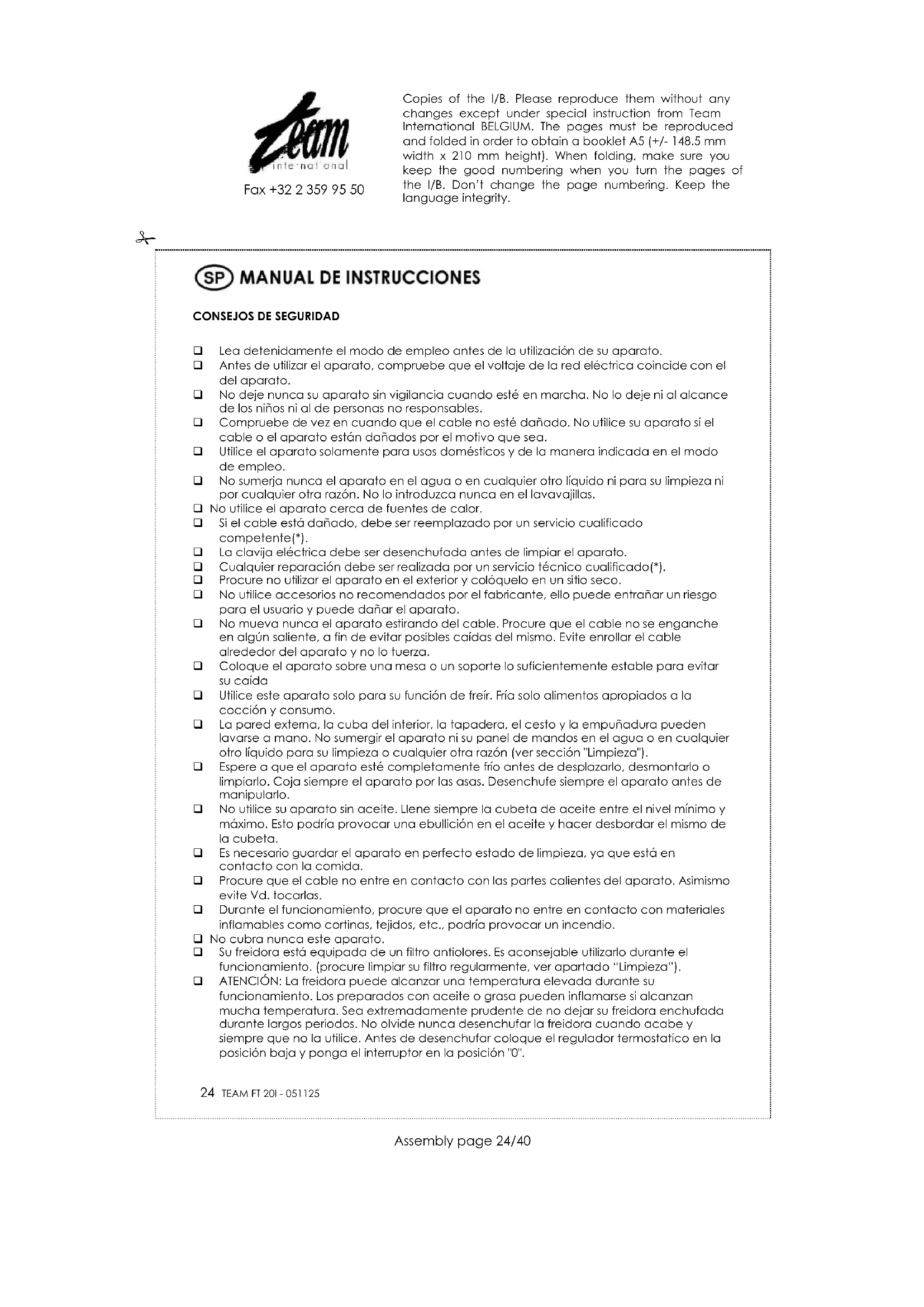 Lea detenidamente el modo de empleo antes de la utilización de su aparato. Antes de utilizar el aparato, compruebe que el voltaje de la red eléctrica coincide con el del aparato. No deje nunca su aparato sin vigilancia cuando esté en marcha. No lo deje ni al alcance de los niños ni al de personas no responsables. Compruebe de vez en cuando que el cable no esté dañado. No utilice su aparato sí el cable o el aparato están dañados por el motivo que sea. Utilice el aparato solamente para usos domésticos y de la manera indicada en el modo de empleo. No sumerja nunca el aparato en el agua o en cualquier otro líquido ni para su limpieza ni por cualquier otra razón. No lo introduzca nunca en el lavavajillas. No utilice el aparato cerca de fuentes de calor. Si el cable está dañado, debe ser reemplazado por un servicio cualificado competente(*). La clavija eléctrica debe ser desenchufada antes de limpiar el aparato. Cualquier reparación debe ser realizada por un servicio técnico cualificado(*). Procure no utilizar el aparato en el exterior y colóquelo en un sitio seco. No utilice accesorios no recomendados por el fabricante, ello puede entrañar un riesgo para el usuario y puede dañar el aparato. No mueva nunca el aparato estirando del cable. Procure que el cable no se enganche en algún saliente, a fin de evitar posibles caídas del mismo. Evite enrollar el cable alrededor del aparato y no lo tuerza. Coloque el aparato sobre una mesa o un soporte lo suficientemente estable para evitar su caída Utilice este aparato solo para su función de freír. Fría solo alimentos apropiados a la cocción y consumo. La pared externa, la cuba del interior, la tapadera, el cesto y la empuñadura pueden lavarse a mano. No sumergir el aparato ni su panel de mandos en el agua o en cualquier otro líquido para su limpieza o cualquier otra razón (ver sección "Limpieza"). Espere a que el aparato esté completamente frío antes de desplazarlo, desmontarlo o limpiarlo. Coja siempre el aparato por las asas. Desenchufe siempre el aparato antes de manipularlo. No utilice su aparato sin aceite. Llene siempre la cubeta de aceite entre el nivel mínimo y máximo. Esto podría provocar una ebullición en el aceite y hacer desbordar el mismo de la cubeta. Es necesario guardar el aparato en perfecto estado de limpieza, ya que está en contacto con la comida. Procure que el cable no entre en contacto con las partes calientes del aparato. Asimismo evite Vd. tocarlas. Durante el funcionamiento, procure que el aparato no entre en contacto con materiales inflamables como cortinas, tejidos, etc., podría provocar un incendio. No cubra nunca este aparato. Su freidora está equipada de un filtro antiolores. Es aconsejable utilizarlo durante el funcionamiento. (procure limpiar su filtro regularmente, ver apartado “Limpieza”). ATENCIÓN: La freidora puede alcanzar una temperatura elevada durante su funcionamiento. Los preparados con aceite o grasa pueden inflamarse si alcanzan mucha temperatura. Sea extremadamente prudente de no dejar su freidora enchufada durante largos periodos. No olvide nunca desenchufar la freidora cuando acabe y siempre que no la utilice. Antes de desenchufar coloque el regulador termostatíco en la posición baja y ponga el interruptor en la posición "0". Copies of the I/B. Please reproduce them without any changes except under special instruction from Team International BELGIUM. The pages must be reproduced and folded in order to obtain a booklet A5 (+/- 148.5 mm width x 210 mm height). When folding, make sure you keep the good numbering when you turn the pages of the I/B. Don‟t change the page numbering. Keep the language integrity.